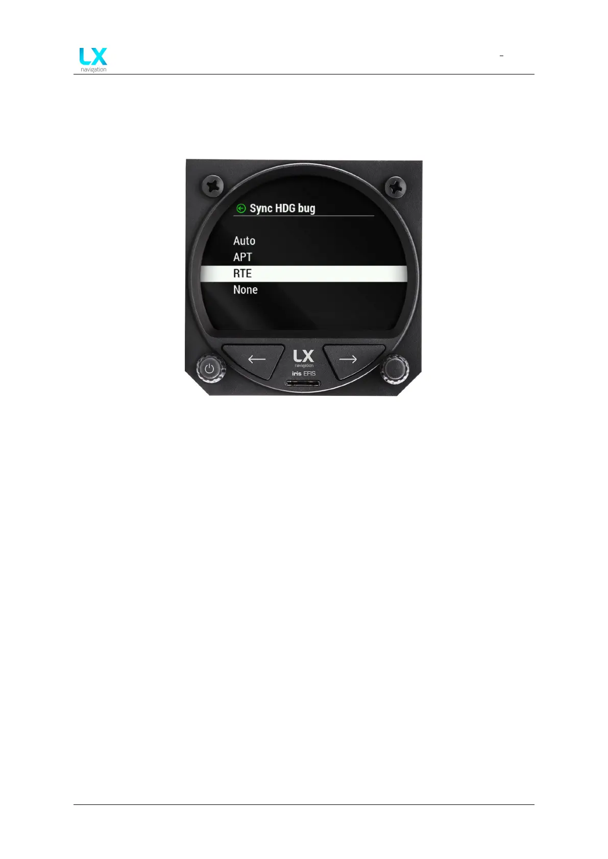 ”Sync HDG bug” and press to select. Pilot can select between ”Auto”, ”APT”, ”RTE” and ”None”.