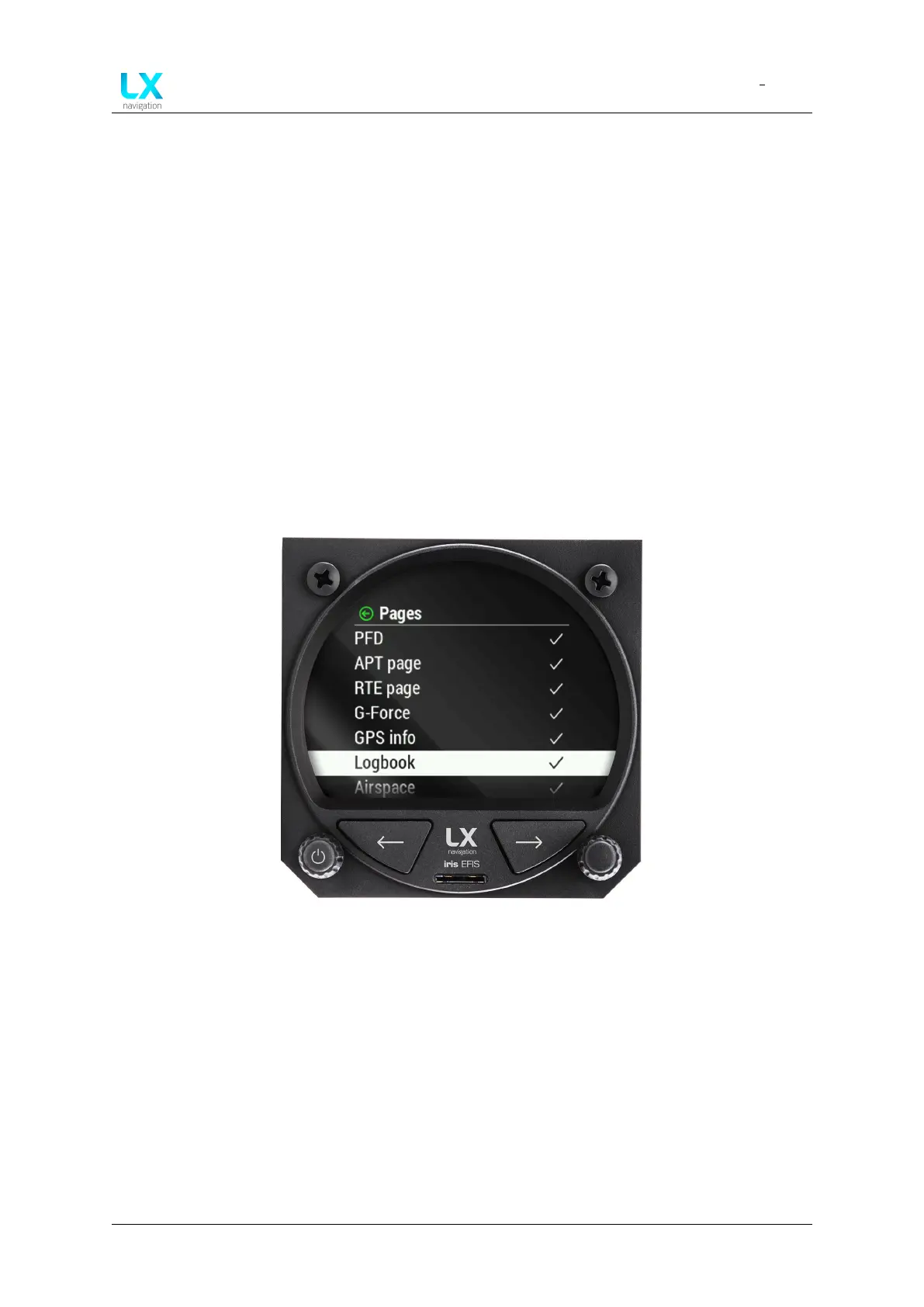 The Pages setting is allowing the pilot to enable and disable all available pages of the LX Hori-