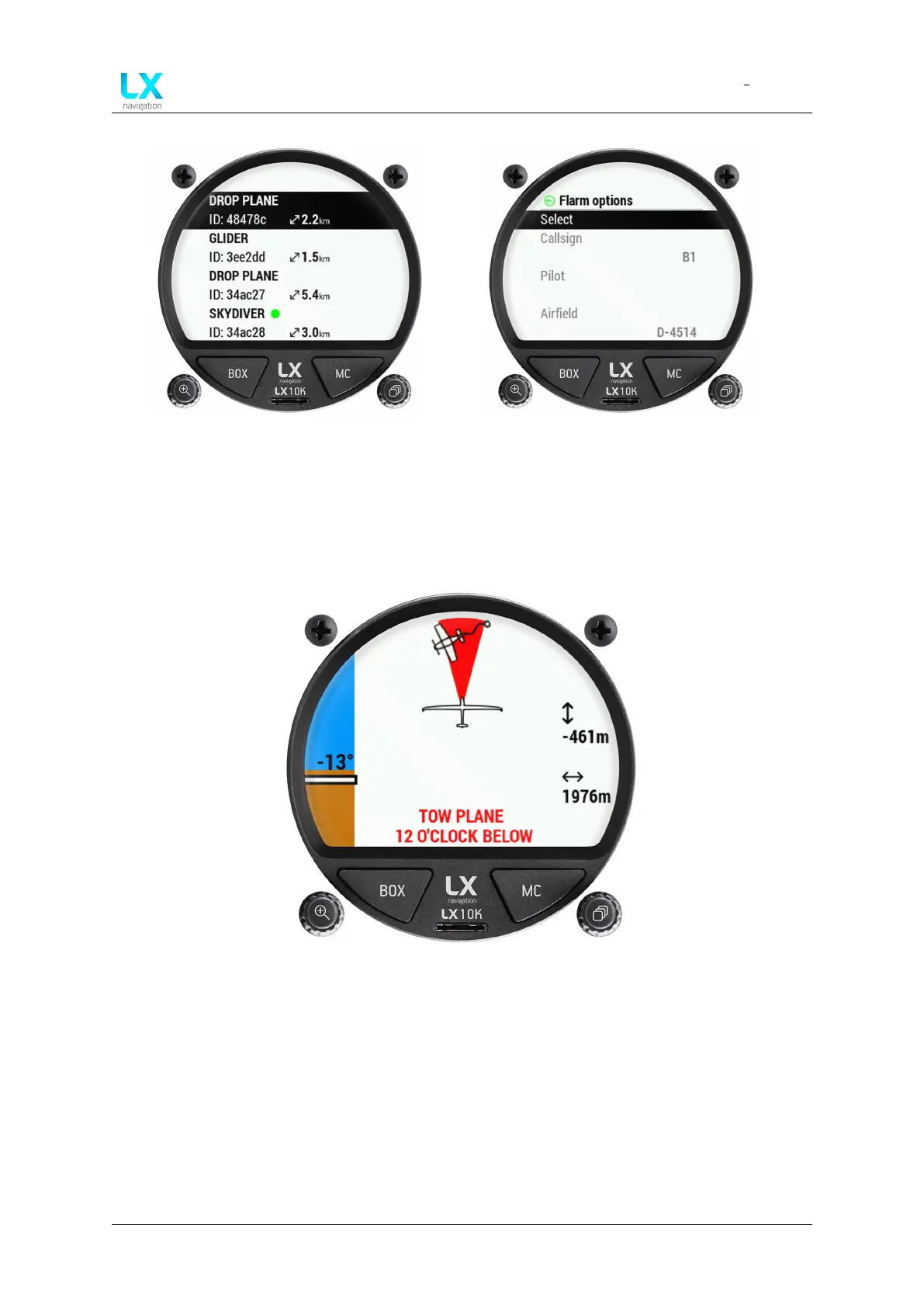 An important safety feature of the LX 10k is the Flarm warning page. This page pops-up