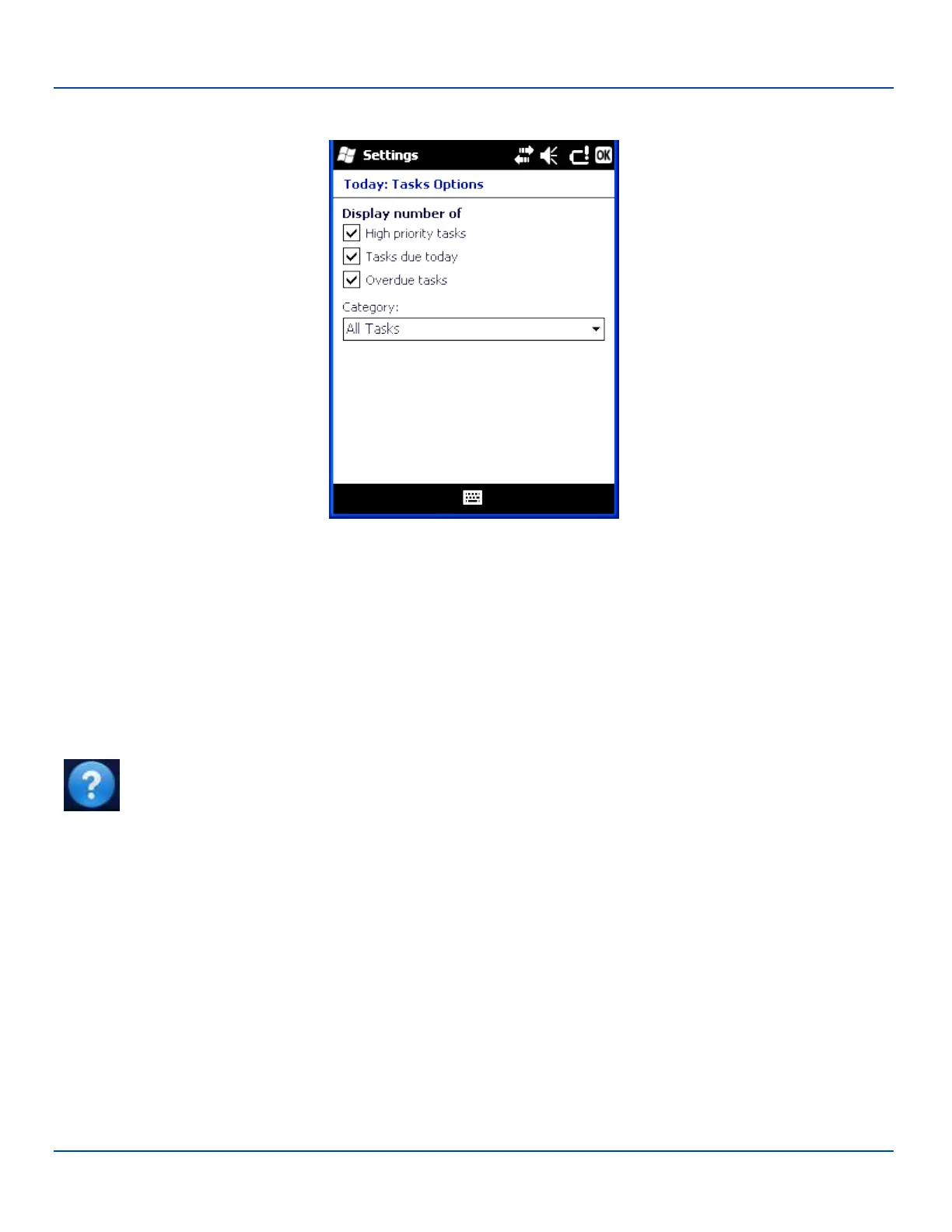 Note: Tap Start | Help for context sensitive Windows Mobile Help when changing or viewing options. Tap the