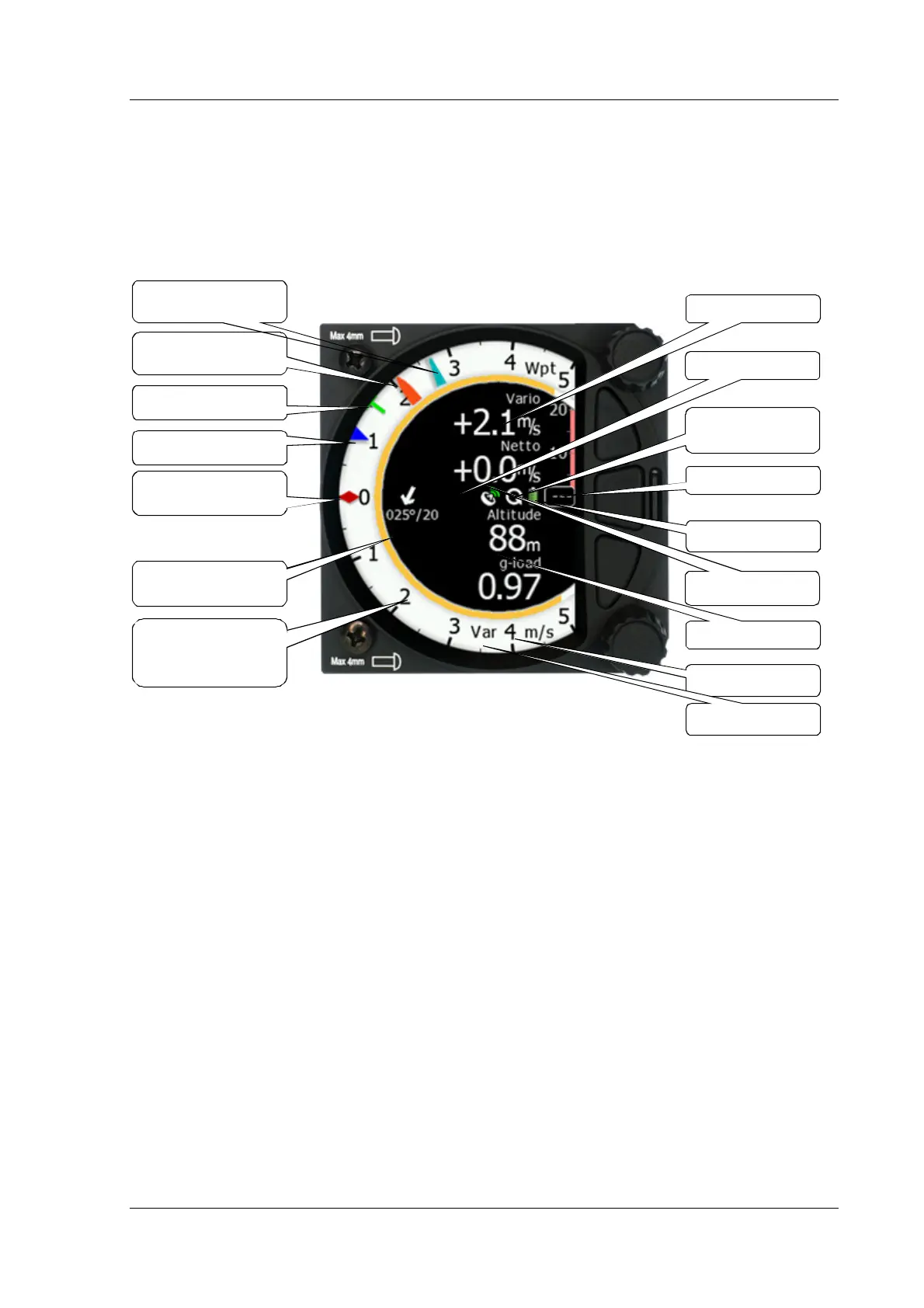 The Vario Needle can display: the Vario, Netto, Relative or Speed to fly value (Setup-
