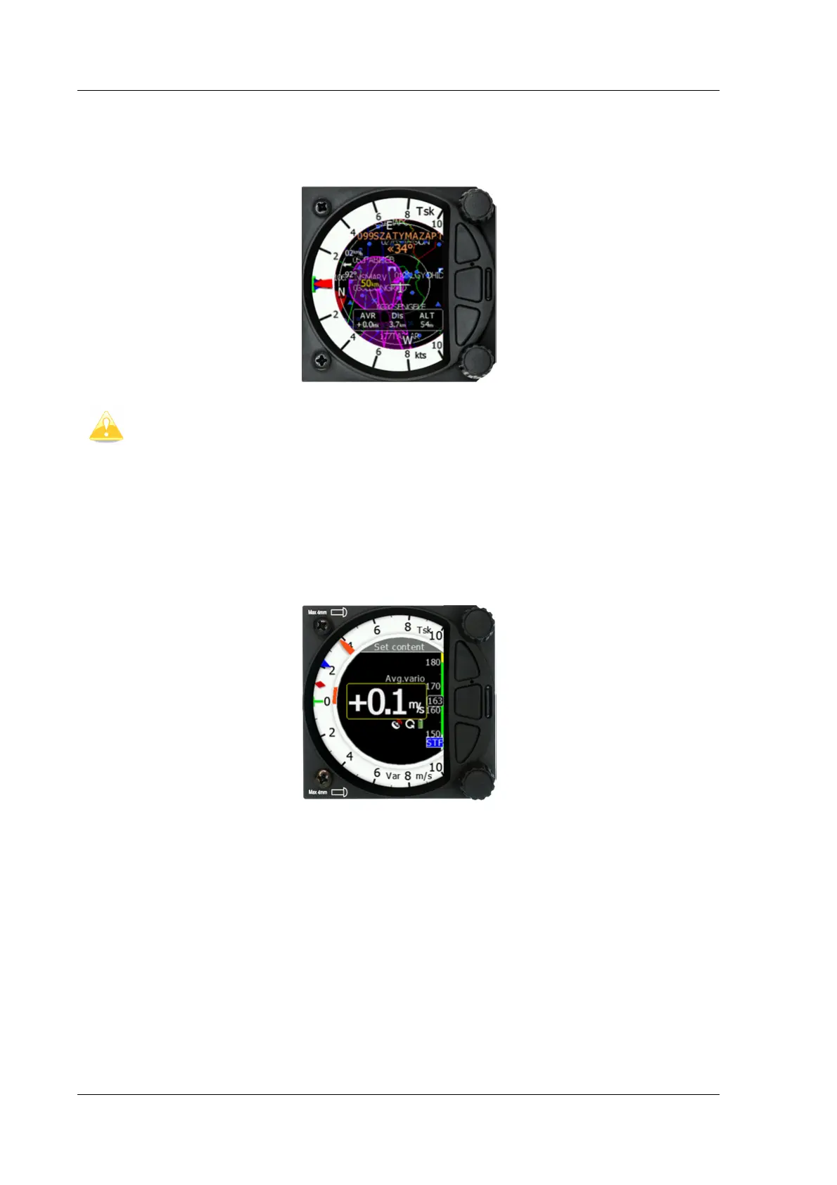 FLARM, GPS, Cruise/Climb and battery. This second page can be selected by pressing the