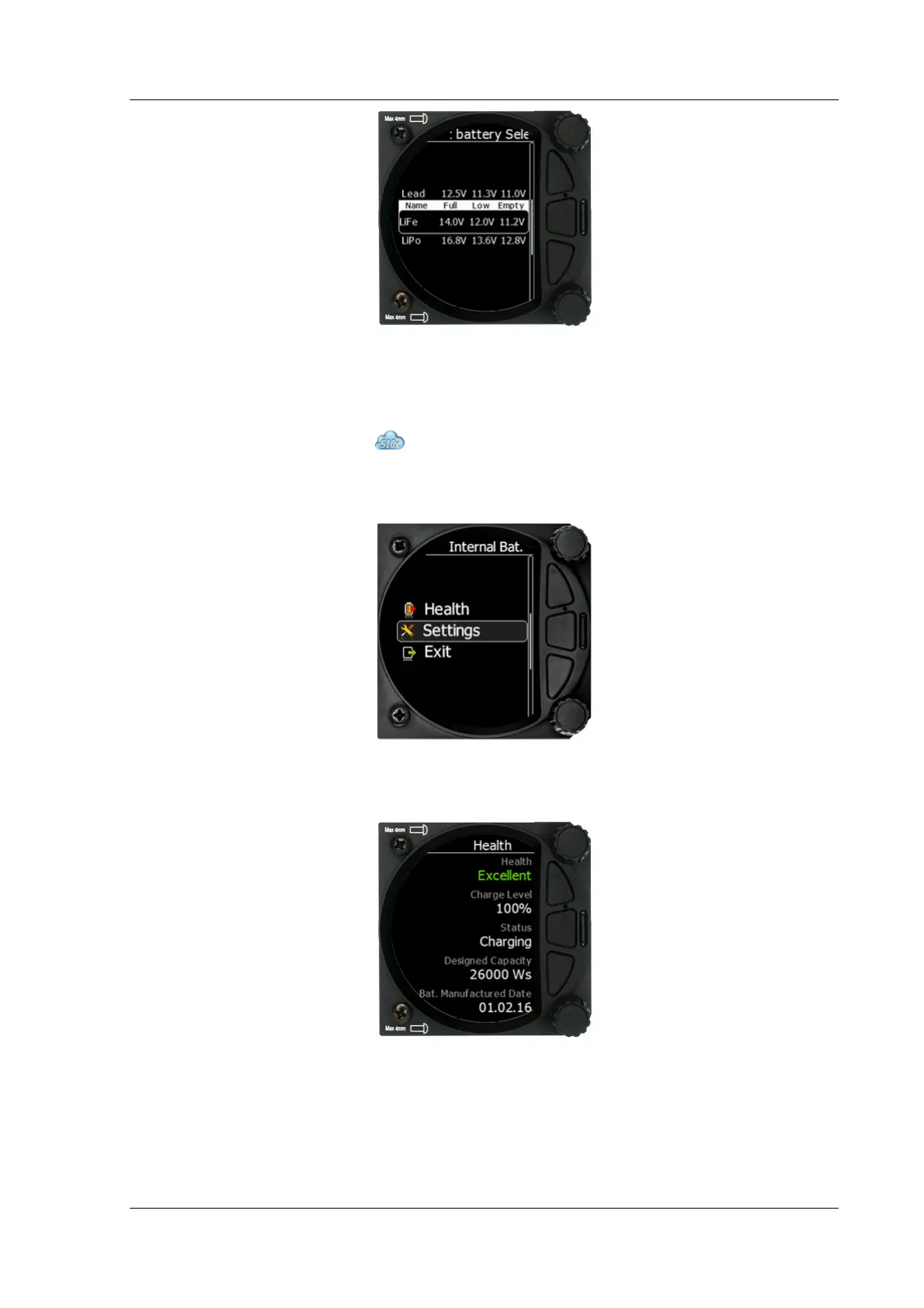 S10x units have also a built-in internal battery where you can check the health and settings