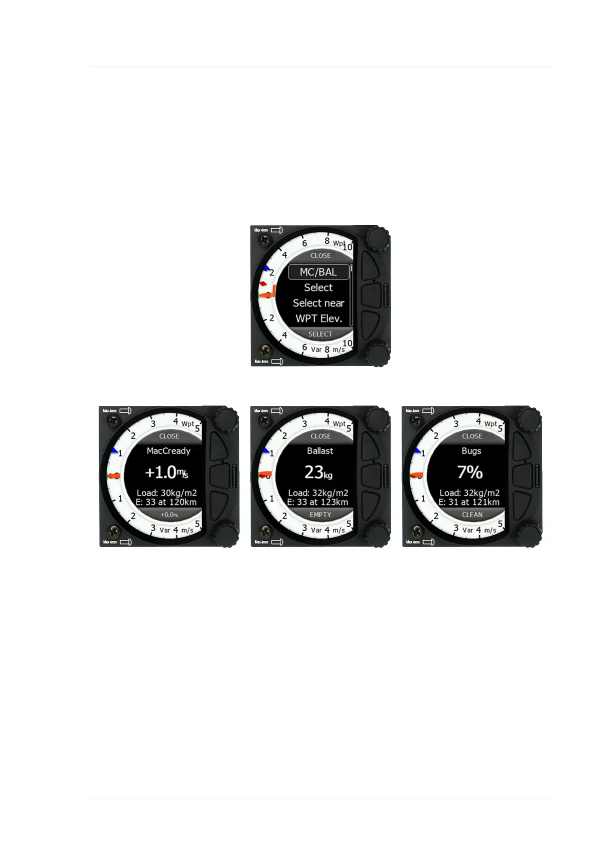 set MacCready, Ballast and Bugs values.