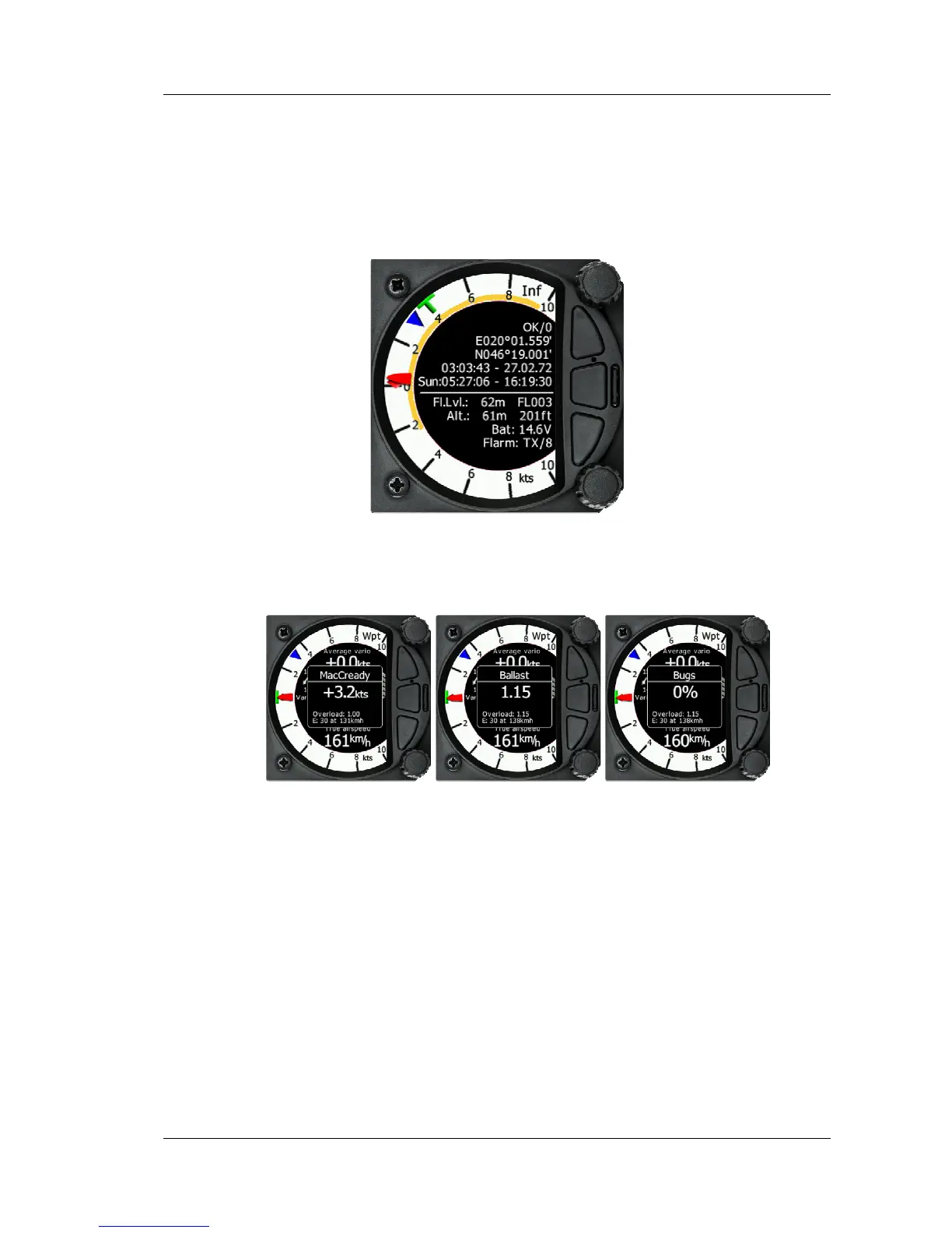 Flight level, altitude, Battery status, and Flarm status. Flight Level equivalent is also