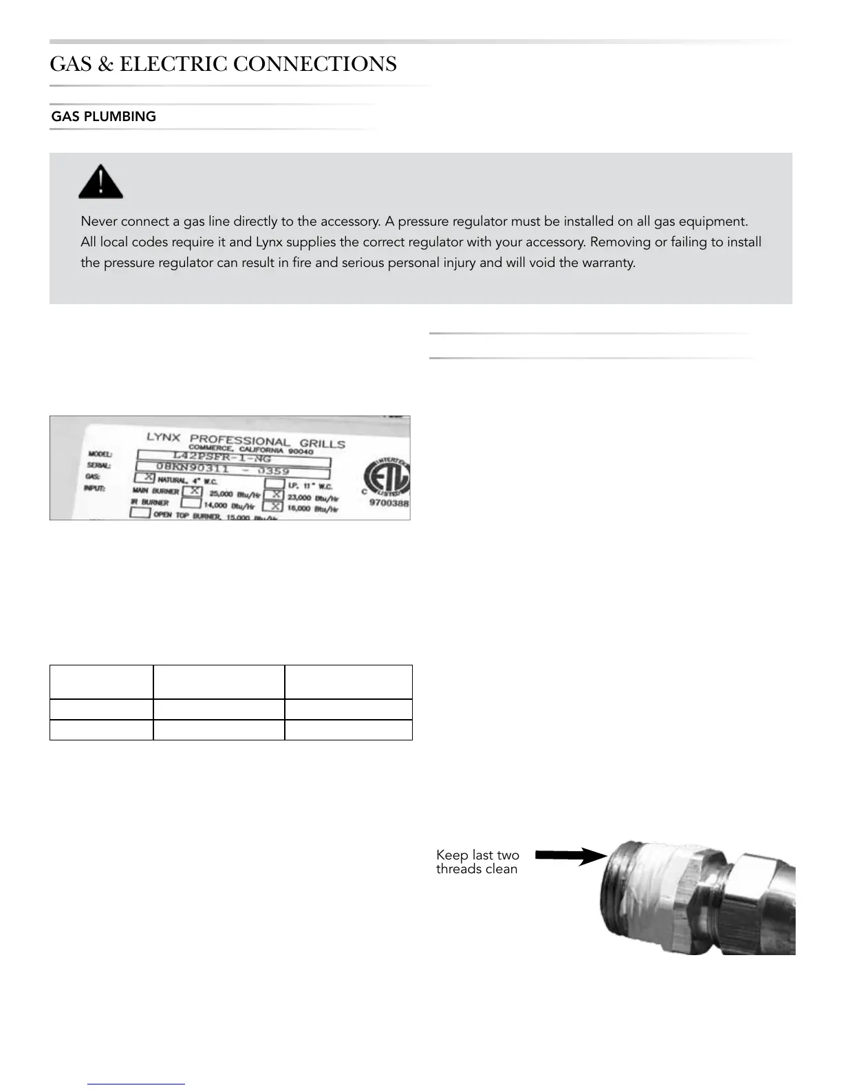 Never connect a gas line directly to the accessory. A pressure regulator must be installed on all gas equipment.