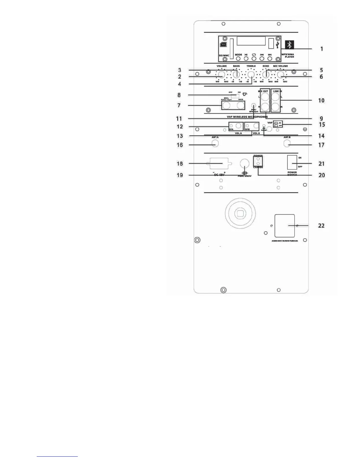 21. Power switch: Switch the unit on / off