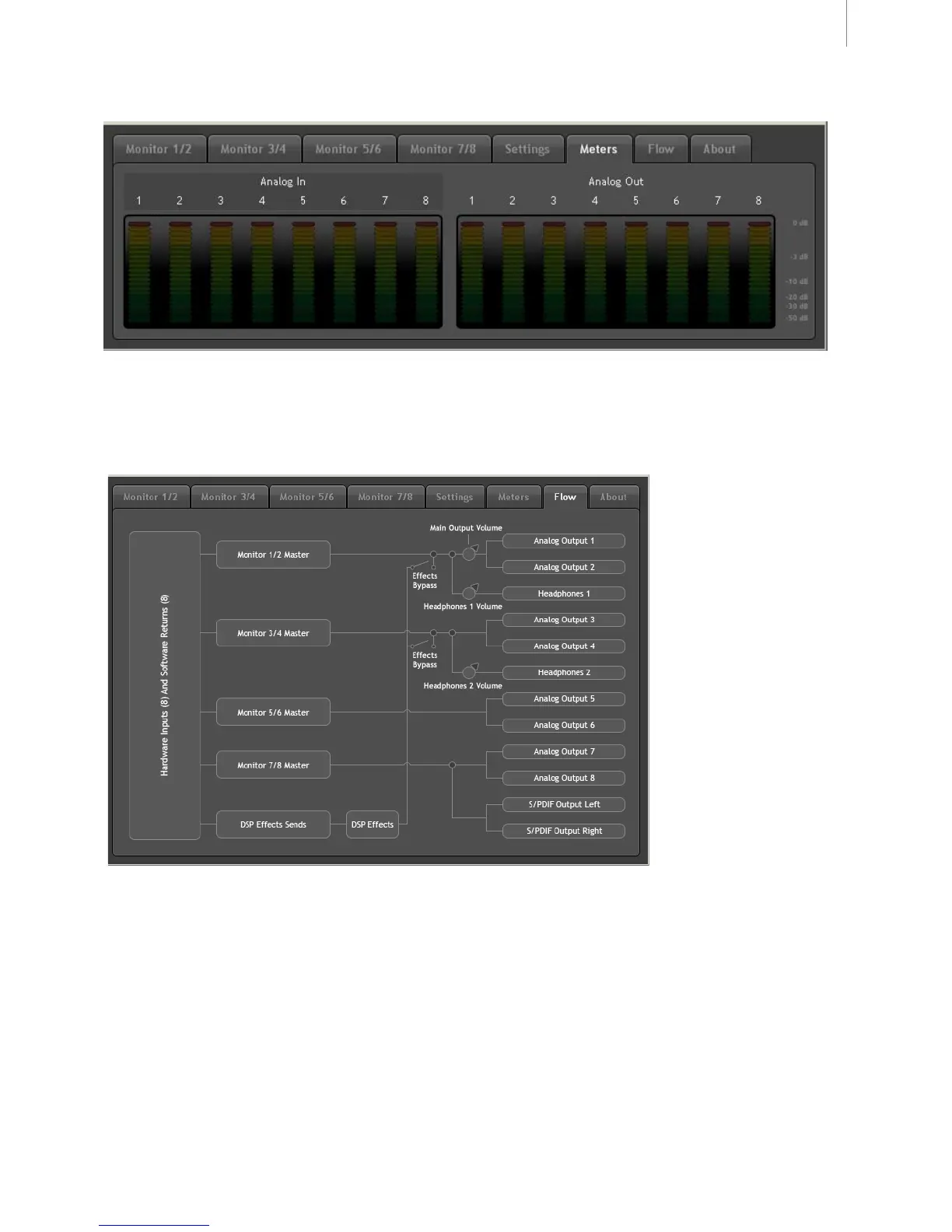 Diese Registerkarte verfügt über Pegelanzeigen für die acht Hardware-Eingänge und acht Hardware-Ausgänge.
