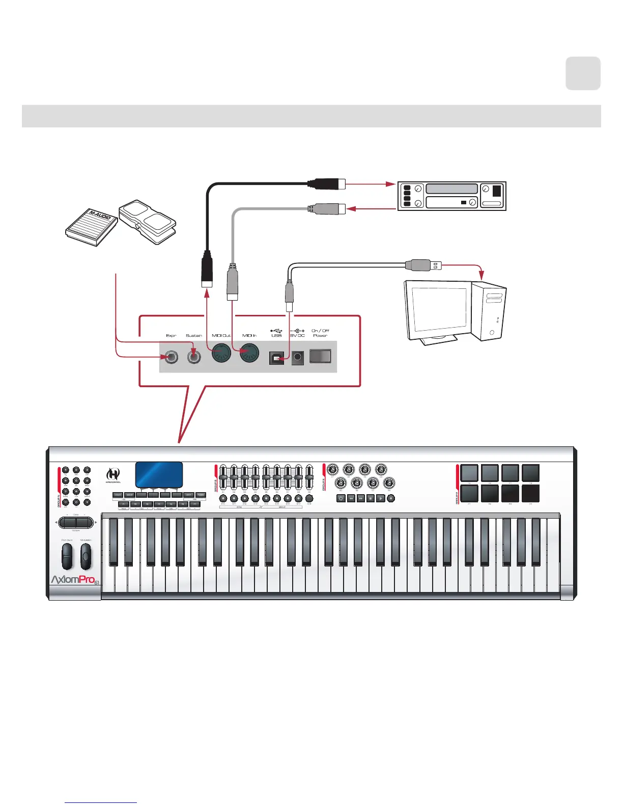 • IfyouwouldliketoconnectAxiomProtoanexternalMIDI-capabledevice(suchasasynthesizer,soundmodule,etc.),