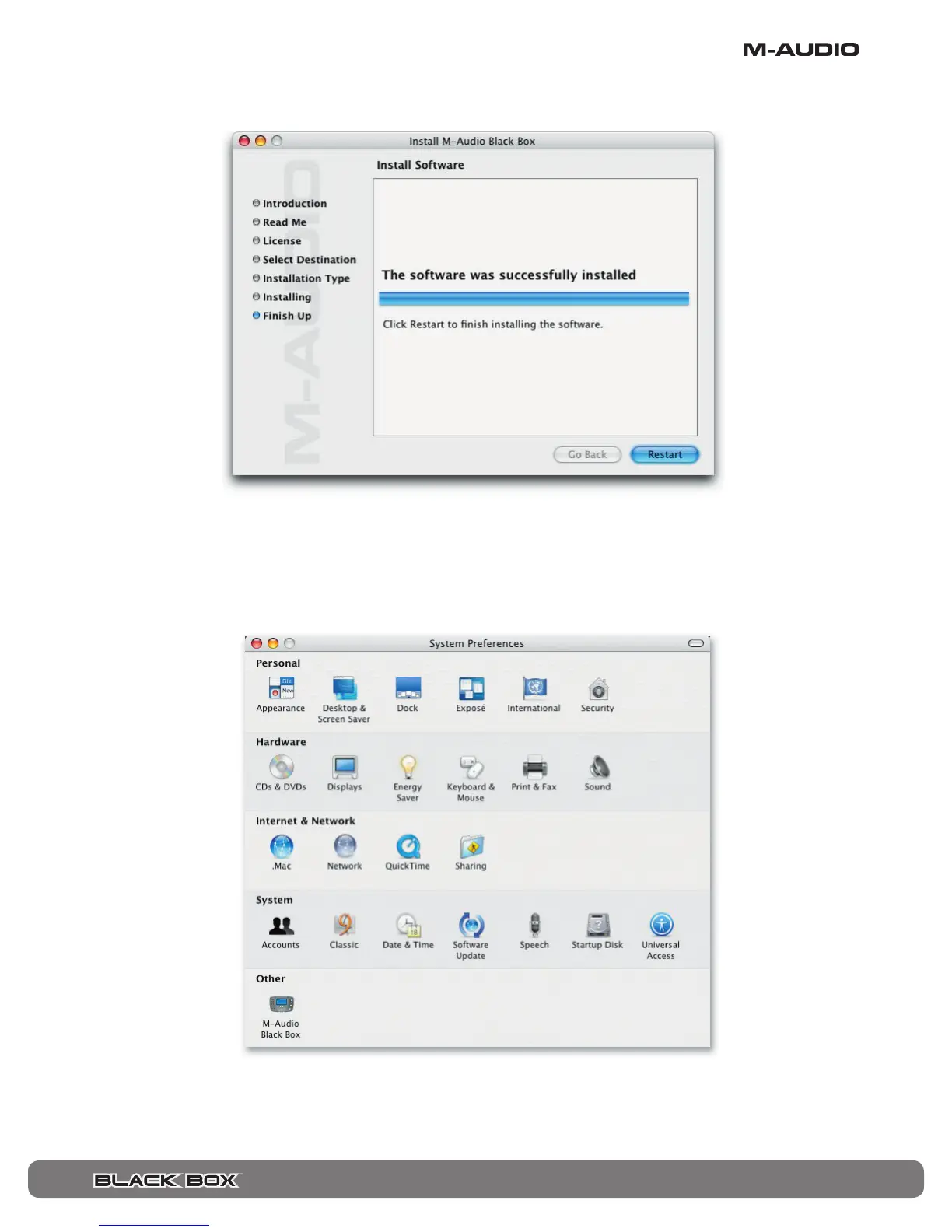 Your M-Audio drivers will install. You will then see that the software was successfully installed. Click Restart.