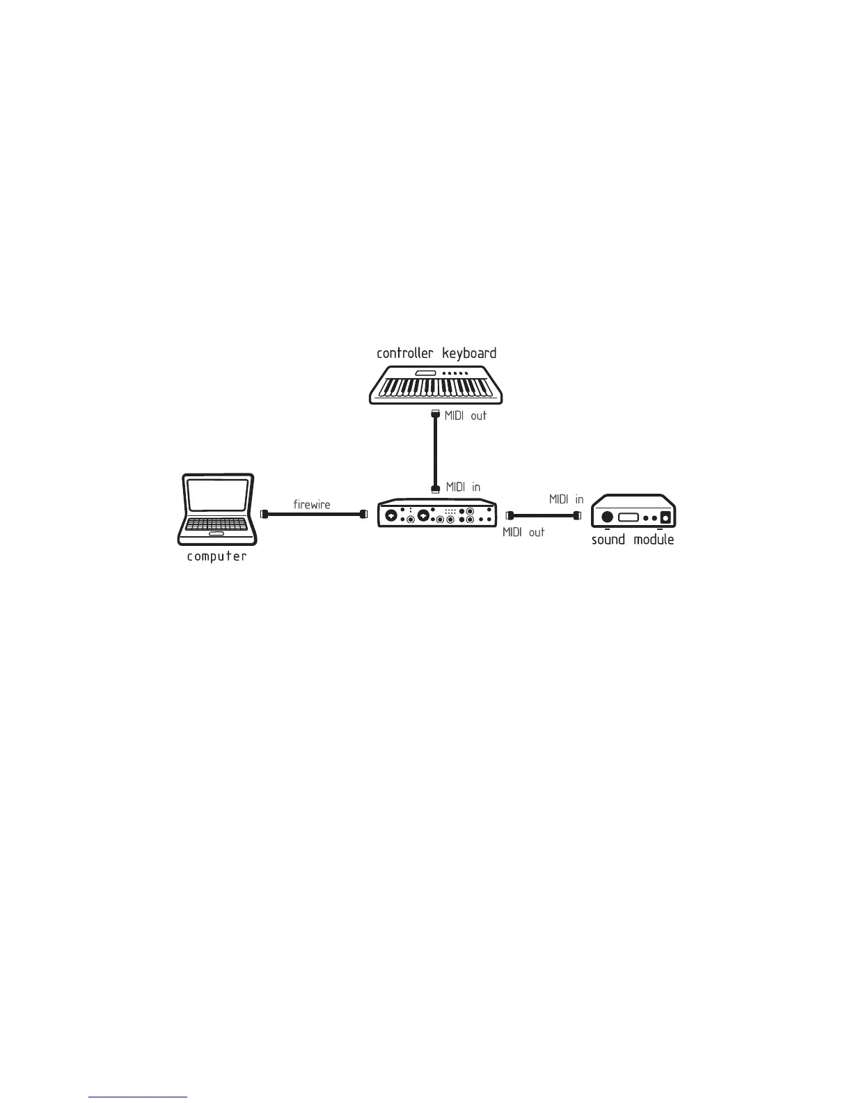 Visualizzata nell'illustrazione seguente è una tastiera controller MIDI collegata all'ingresso MIDI di FireWire 410. Un modulo sonoro MIDI
