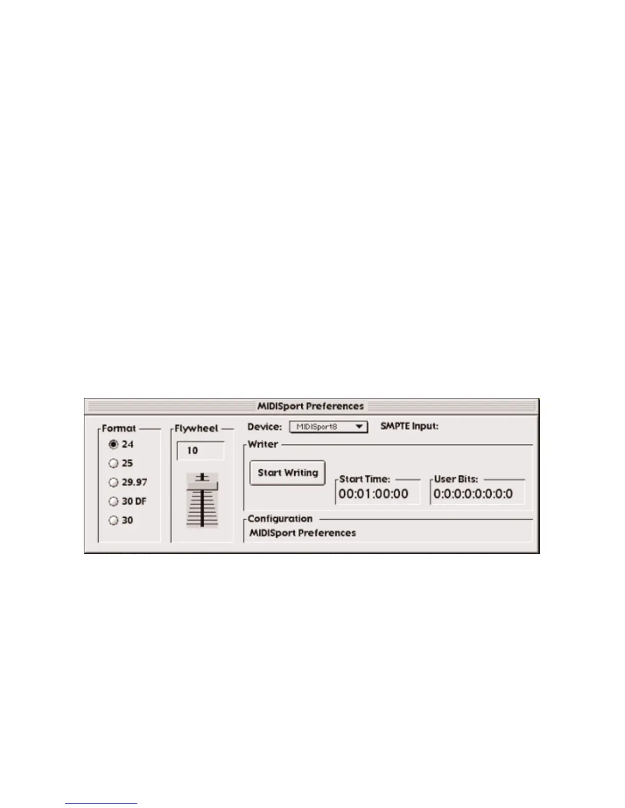 the MIDISPORT SMPTE generator. Flywheel sets the number of frames the