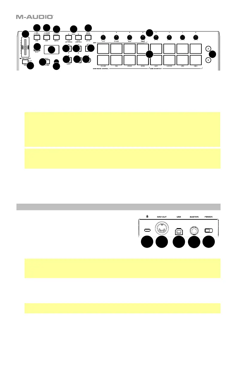 22. Knobs: Turn these knobs left/right to perform their assigned controls. When operating with a DAW, the