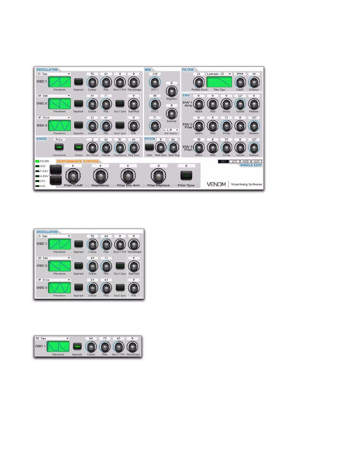 The Oscillator (OSC) page of the Single Program Editor provides access to the Oscillator, Mix, Filter, Envelope,