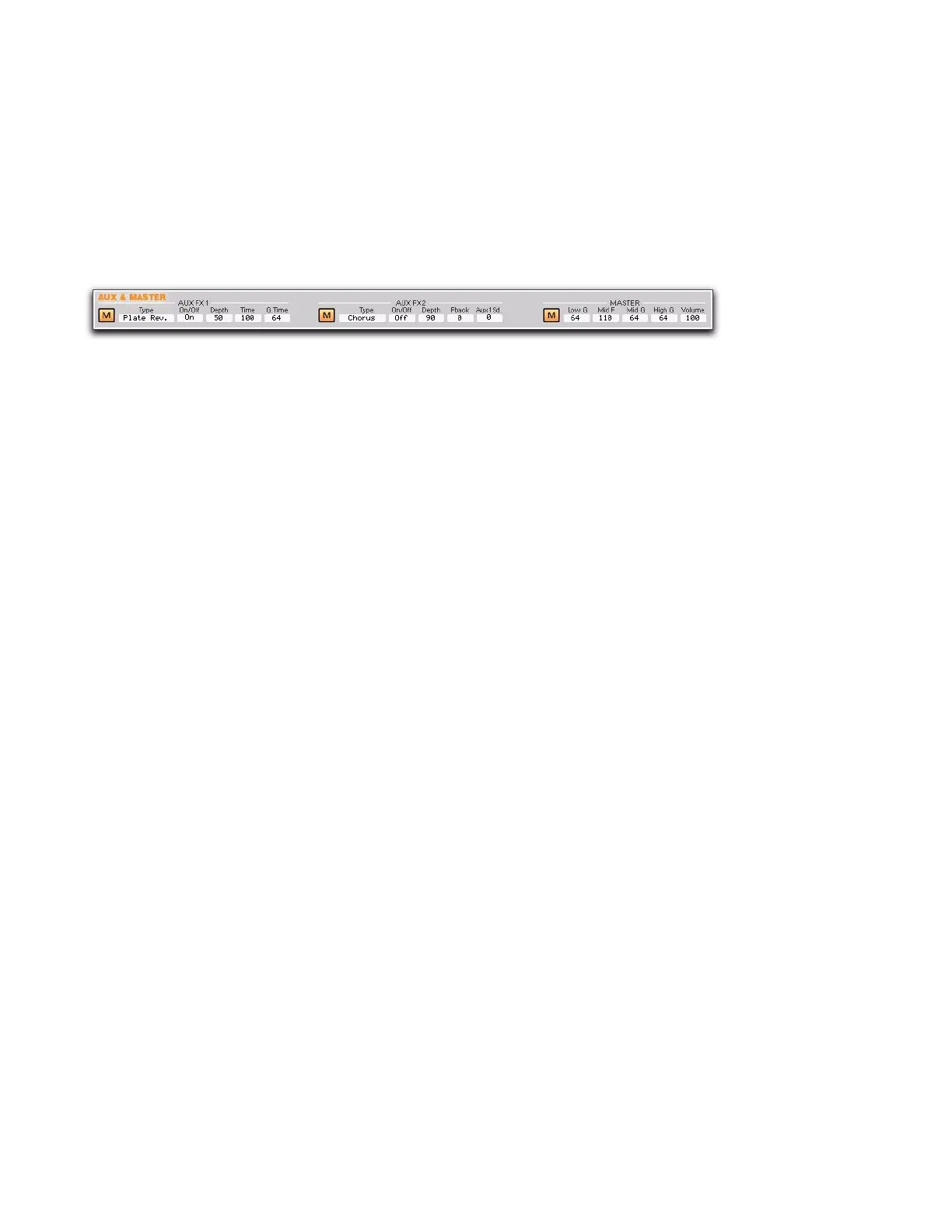 The Aux and Master controls let you set the Auxiliary Effect 1, Auxiliary Effect 2, and Master controls for the
