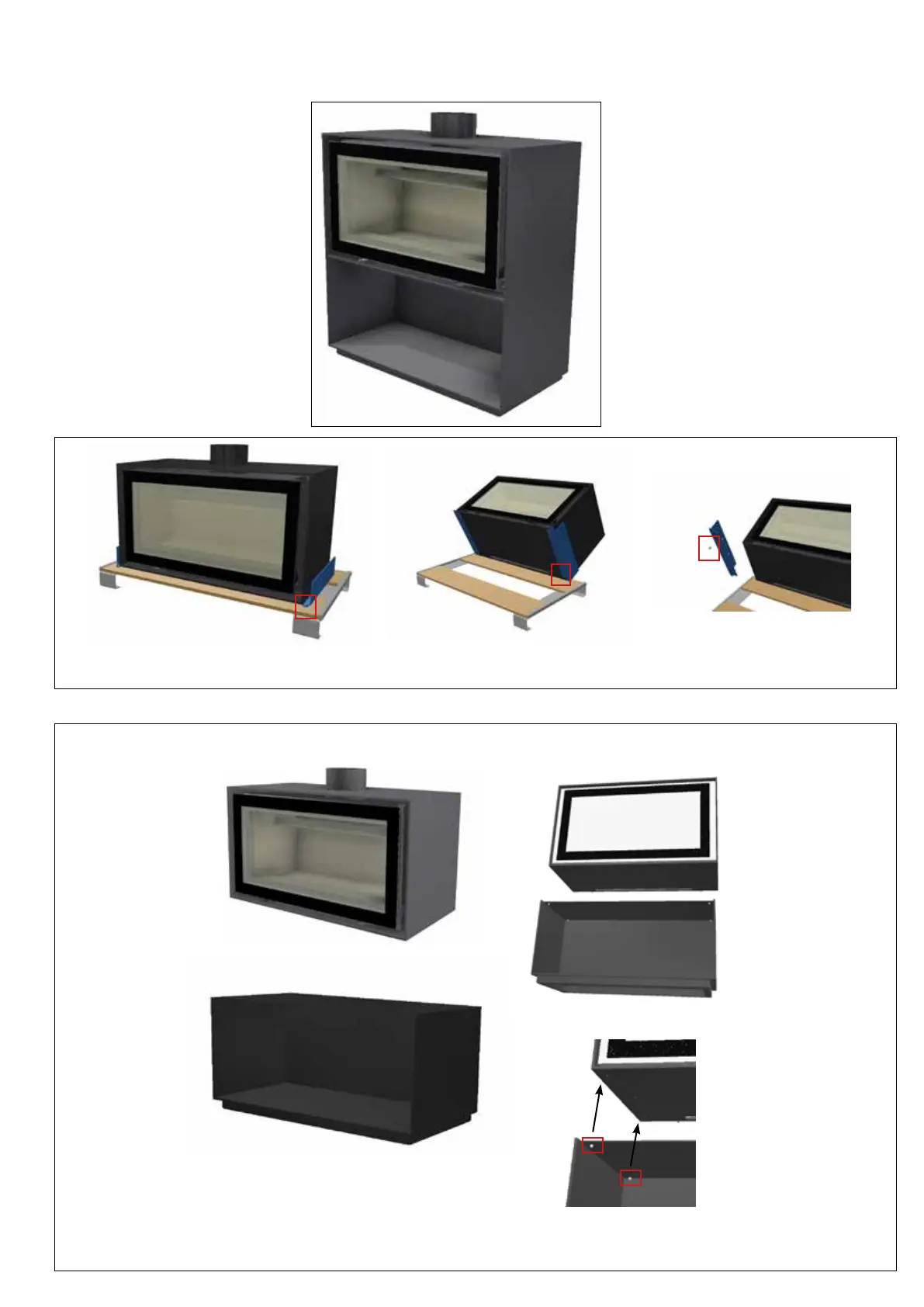 The Venus in the MBox is delivered on a pallet. Unscrew the wood screws (A). Tilt the fireplace back and unscrew the 4 bolts (B) to