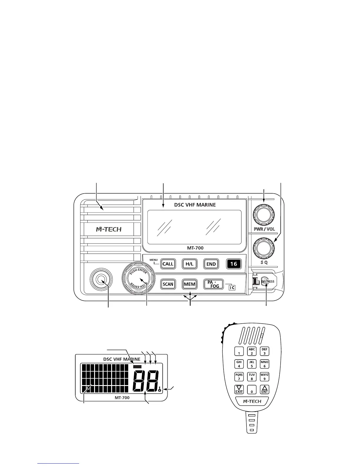 ) button and a keypad on the microphone. The 4-line LCD displays the