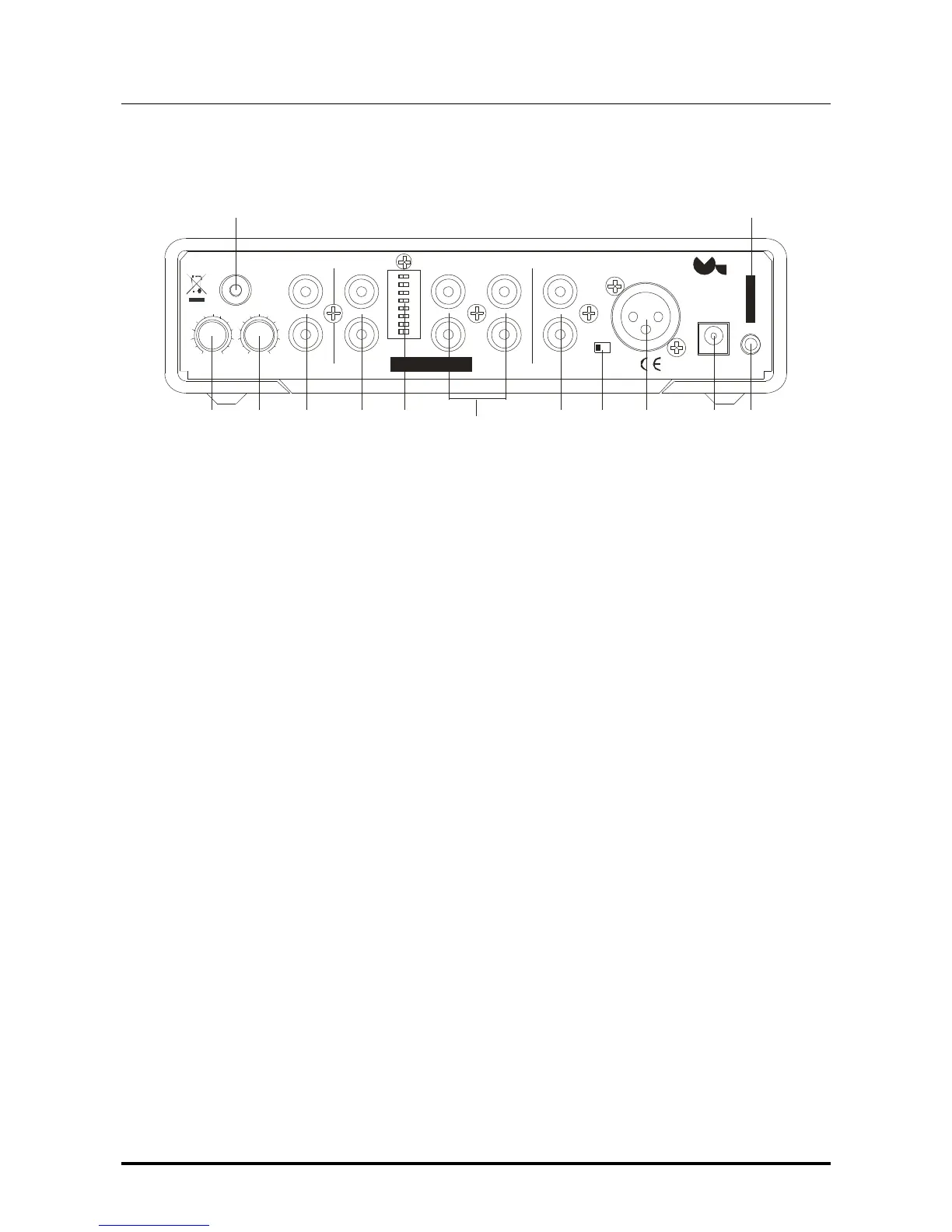 11) Line inputs. Connect line-level sources like tuners, tape decks, TV’s. Female RCA.
