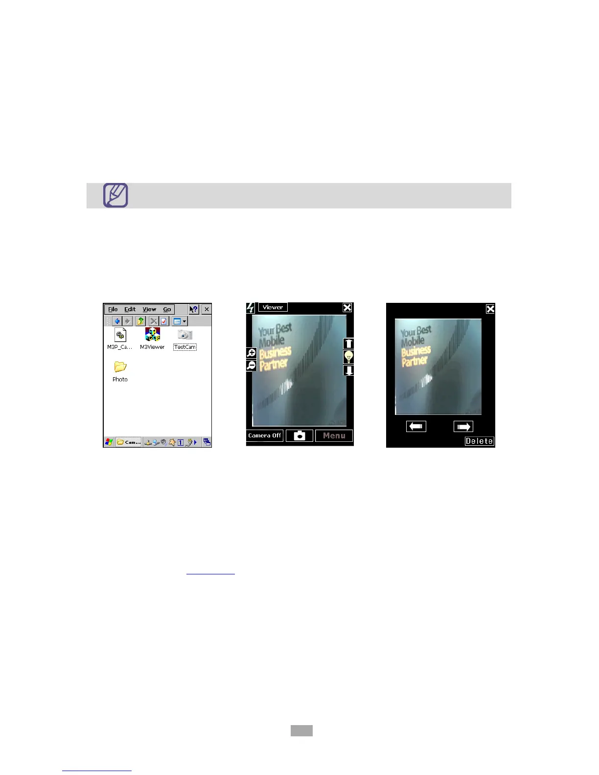 M3 camera application is located at \Flash Disk\Camera folder. To launch, click on