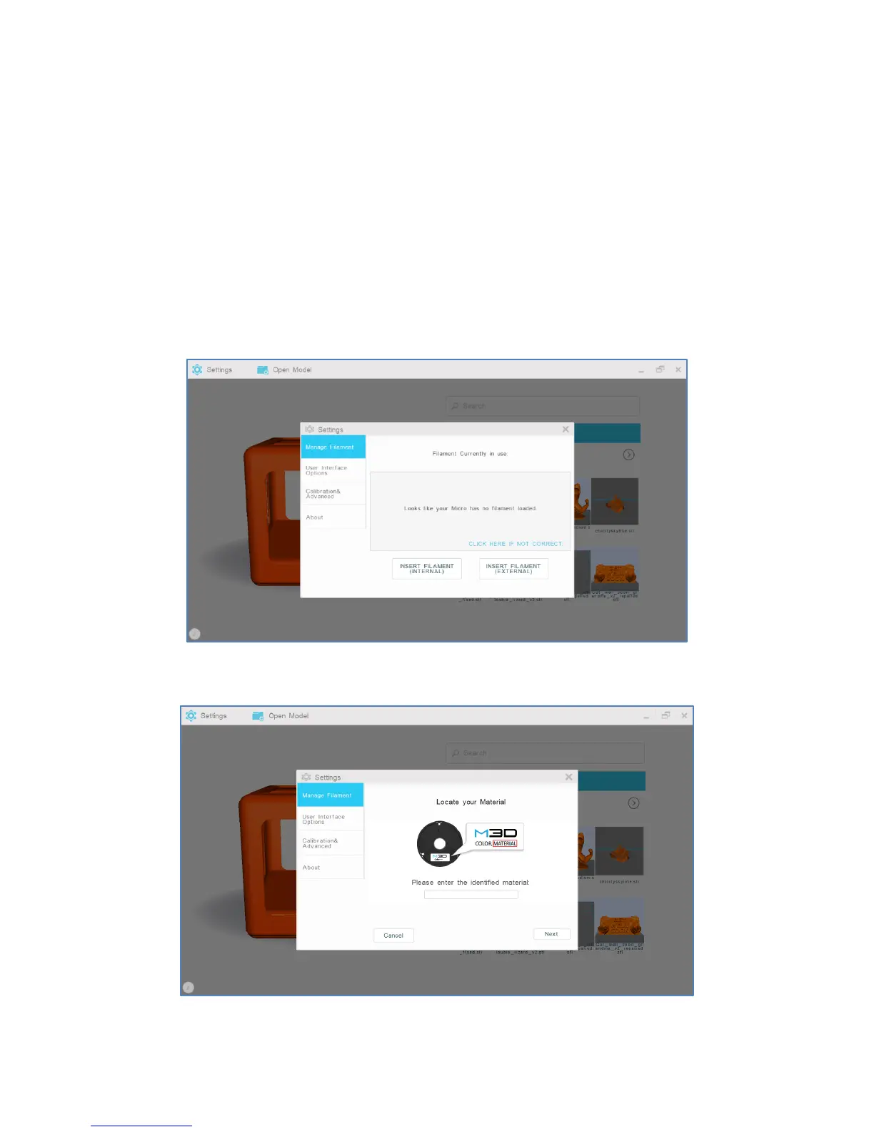 1. To load filament into the external feed port, select “Settings” from the M3D software’s main interface.