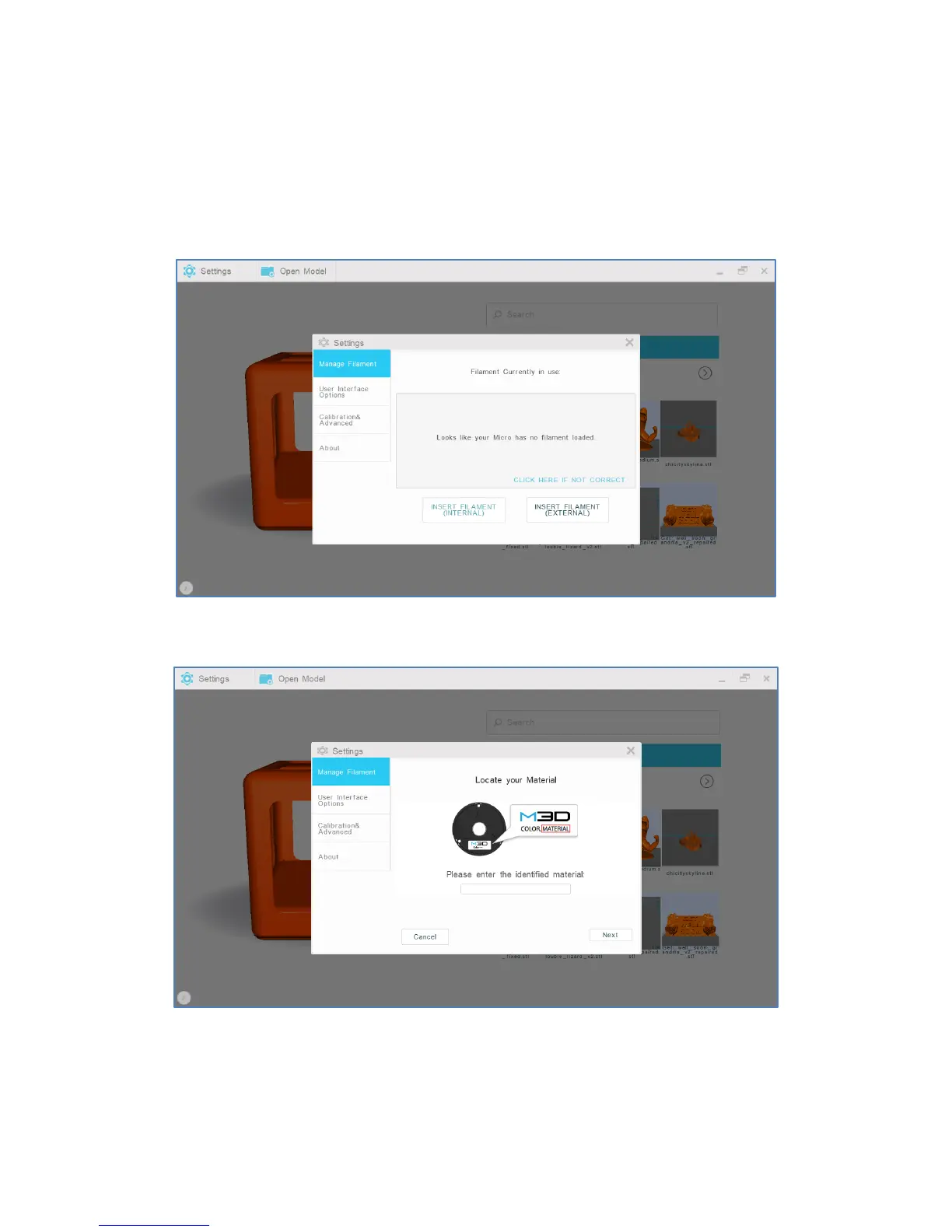 1. To load filament into the internal feed port, select “Settings” from the M3D software’s main interface.