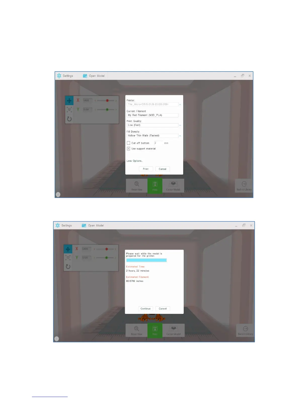 4. Select “Print” and confirm estimated time and filament amount. Then, select “Continue.”