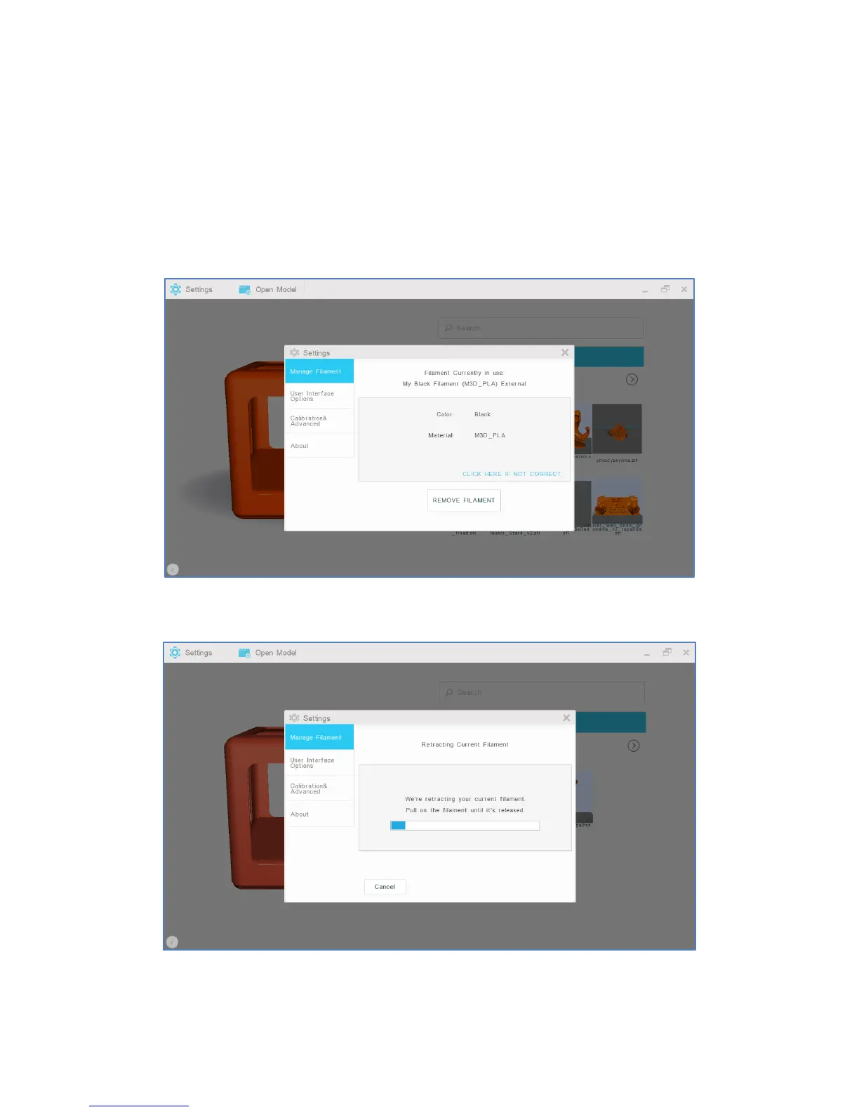 1. To remove filament from the external feed port, select “Settings” from the M3D software’s main