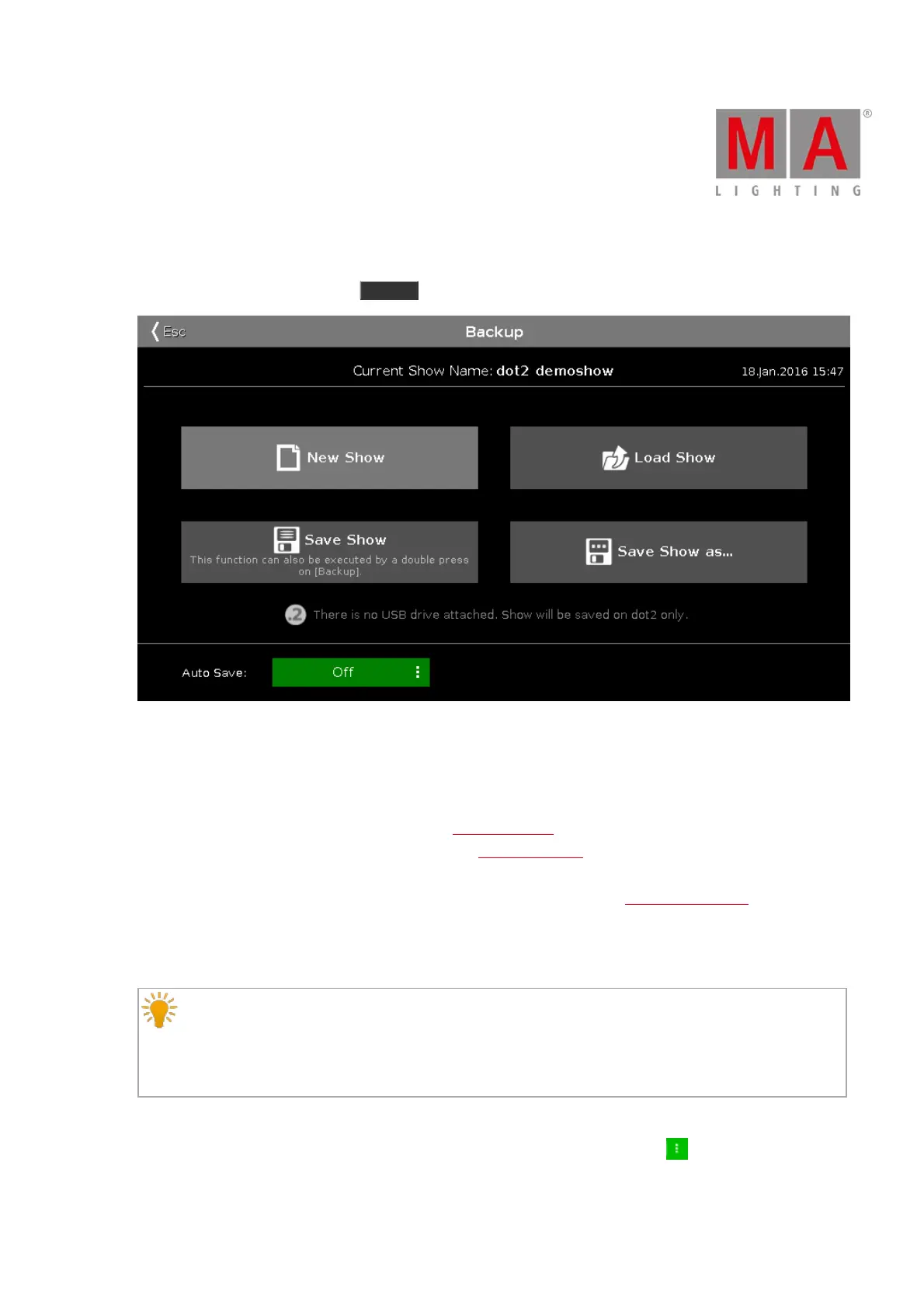 If you save a show and a USB drive is attached, the show will be saved on the USB drive as well.