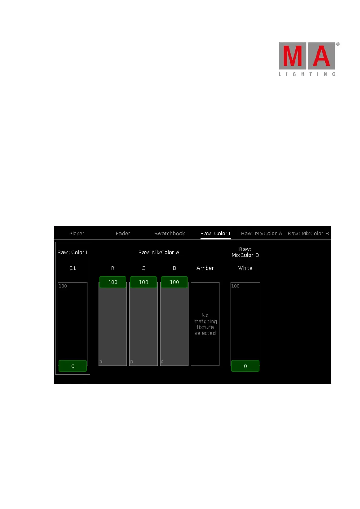 In the raw color view, you control the raw color channel values in percent from the selected fixtures.