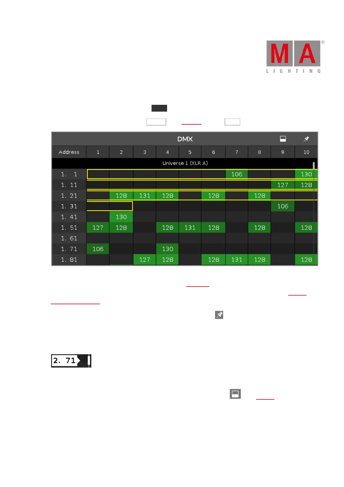 To show the DMX attributes the respective DMX address, press the view icon in the title bar.