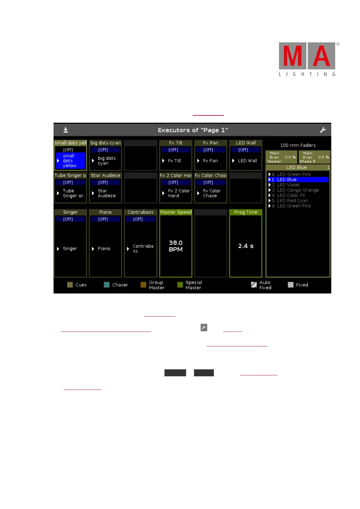 The blue bar displays the fade time of the cue from 0 % to 100 %.