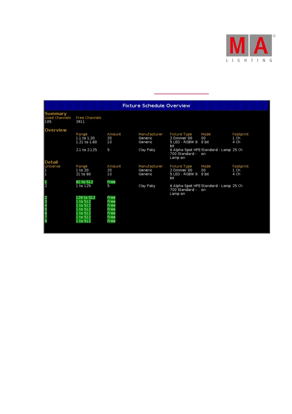 The summary displays how many DMX channels are in use and how many DMX channels are free.