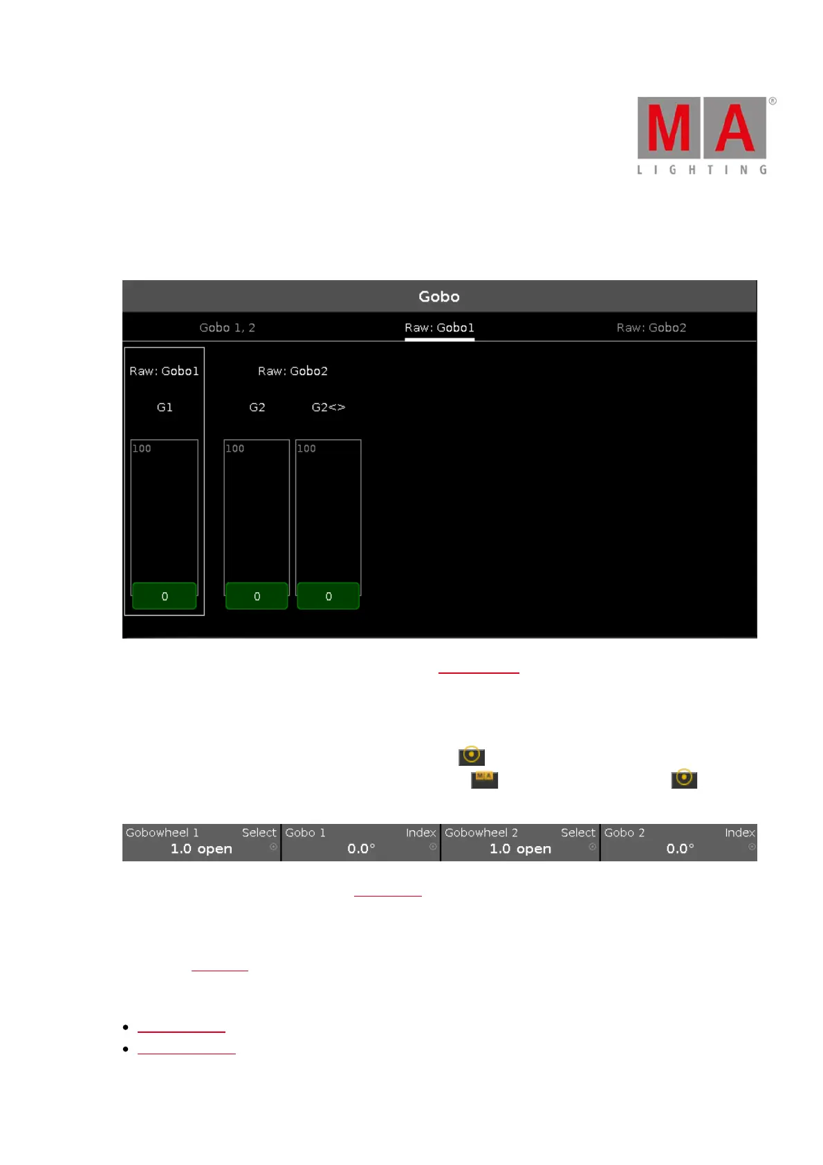 In the raw gobo view, you control the raw gobo values in natural values (0-100) from the selected fixtures.