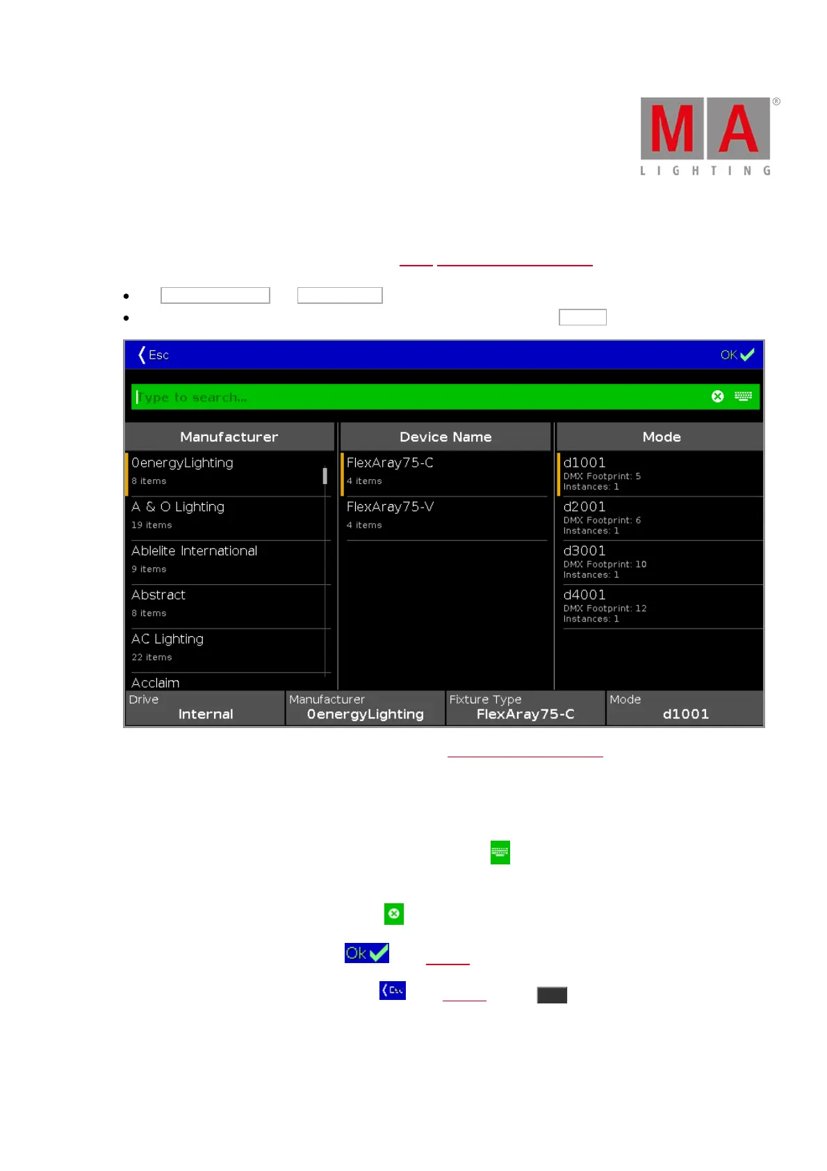 To search for a specific manufacturer, device name or mode: Tap at the right of the green edit line and type