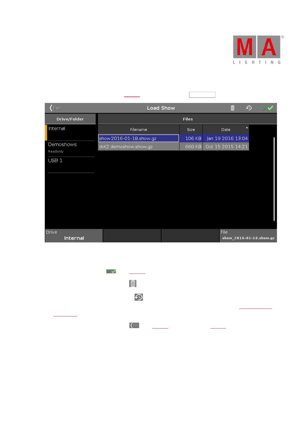 To load a selected file, tap OK in the title bar. The show file will be loaded and opens.