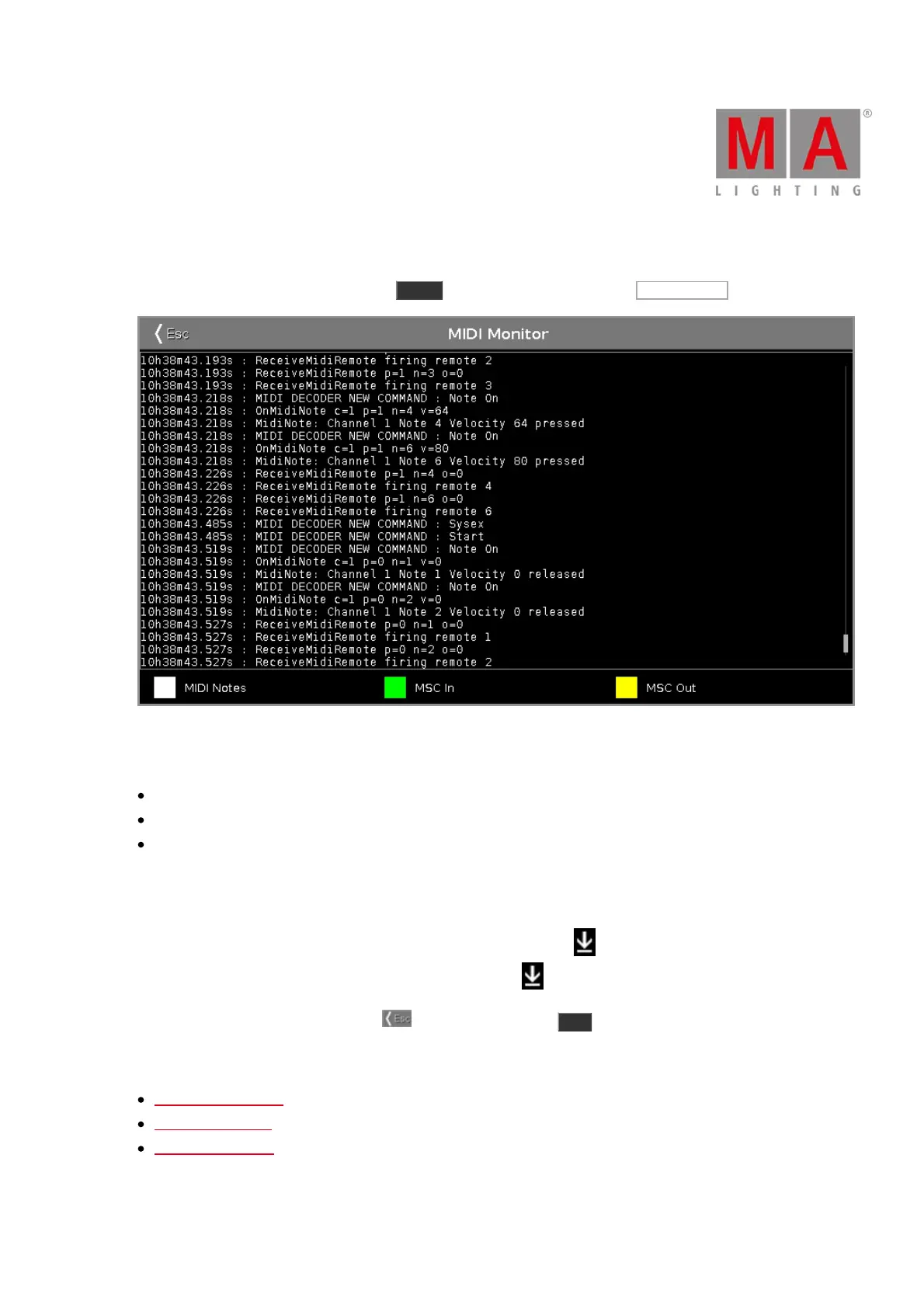 If you are not at the end of the MIDI Monitor, there is a direction arrow displayed.