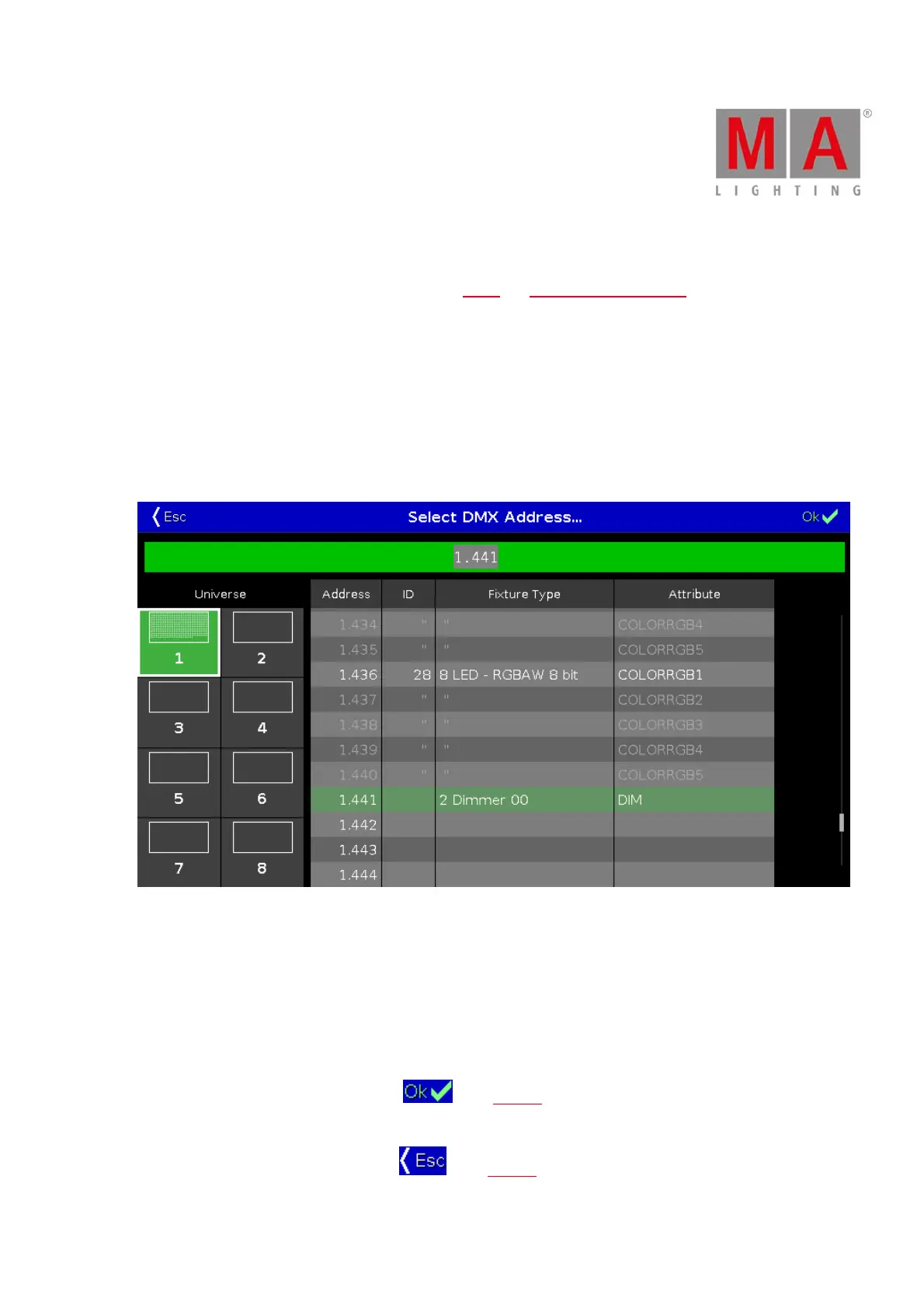 To confirm a selected DMX address, press in the title bar. The window closes and you are back in the