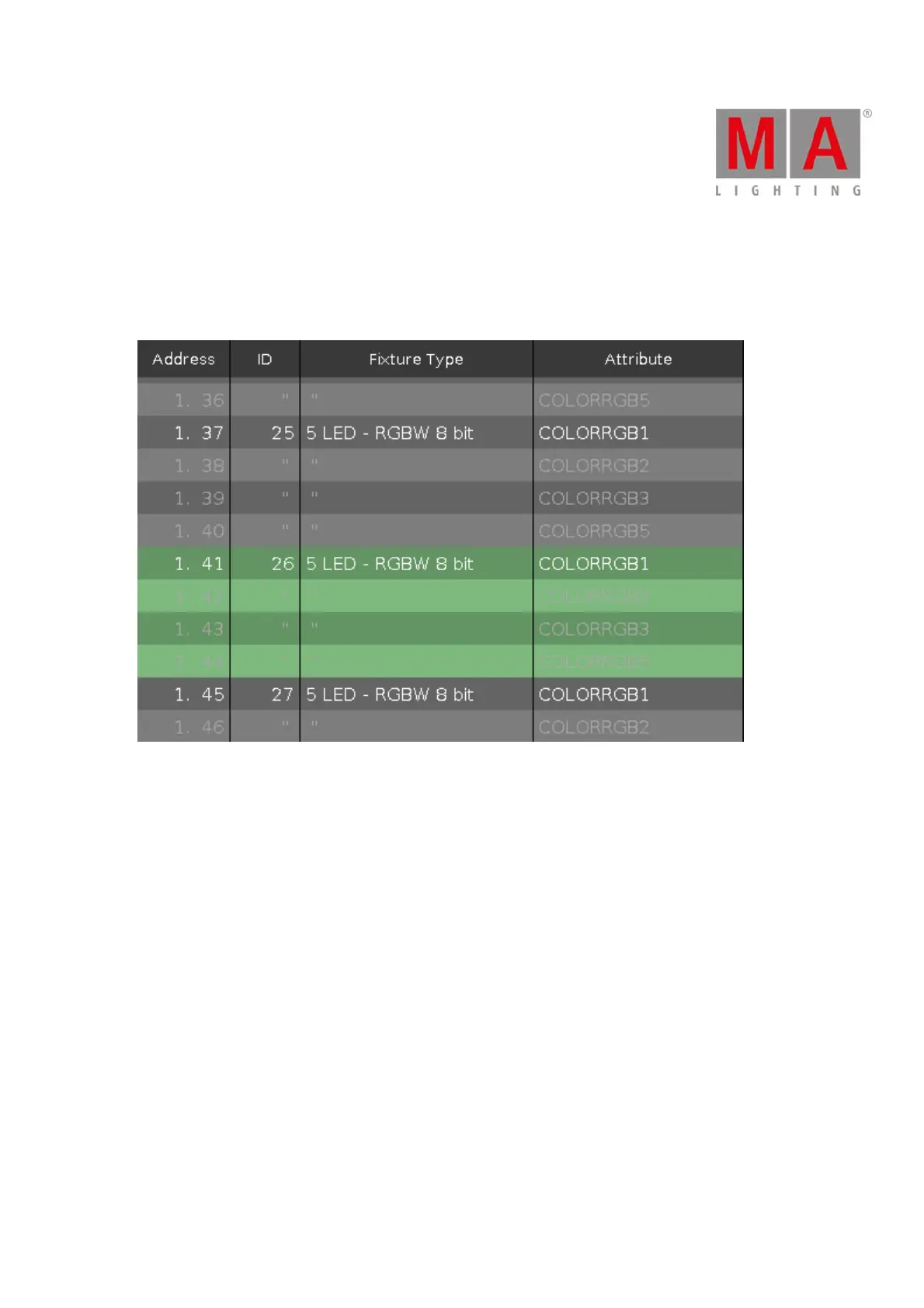 If a fixture needs more than one DMX address, the first column is in a white font and all following are in a gray