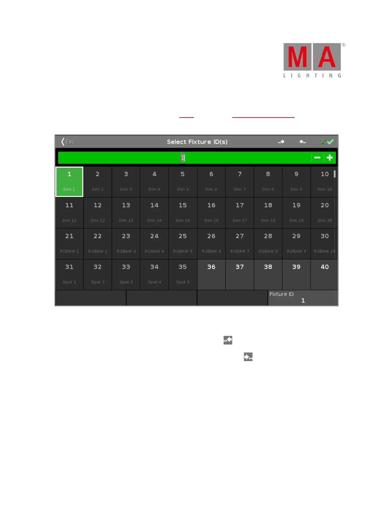To jump to the next available fixture ID forwards, tap the jump forwards icon .