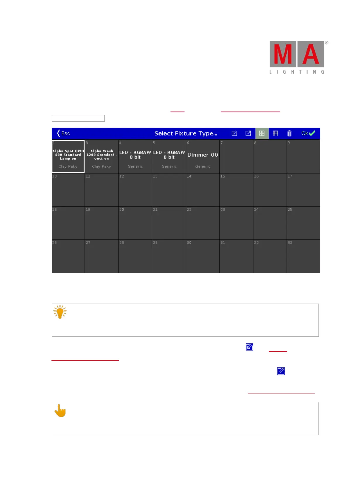 The Select Fixture Type... Window is located in the Setup, column Show, Patch & Fixture Schedule, tap