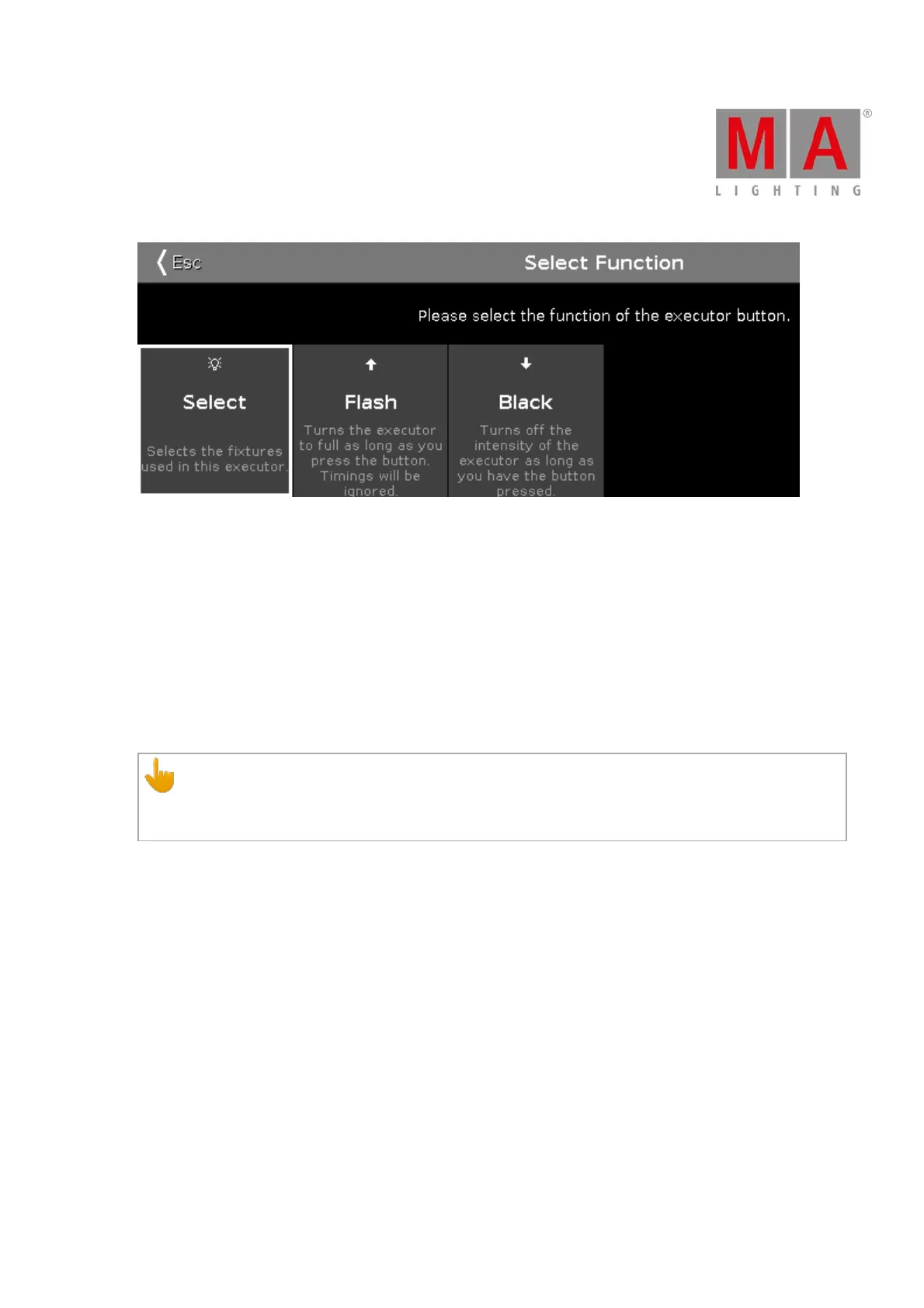 Flash (Only for executors with faders): Sets the group master to 100 %, as long as you press and hold the