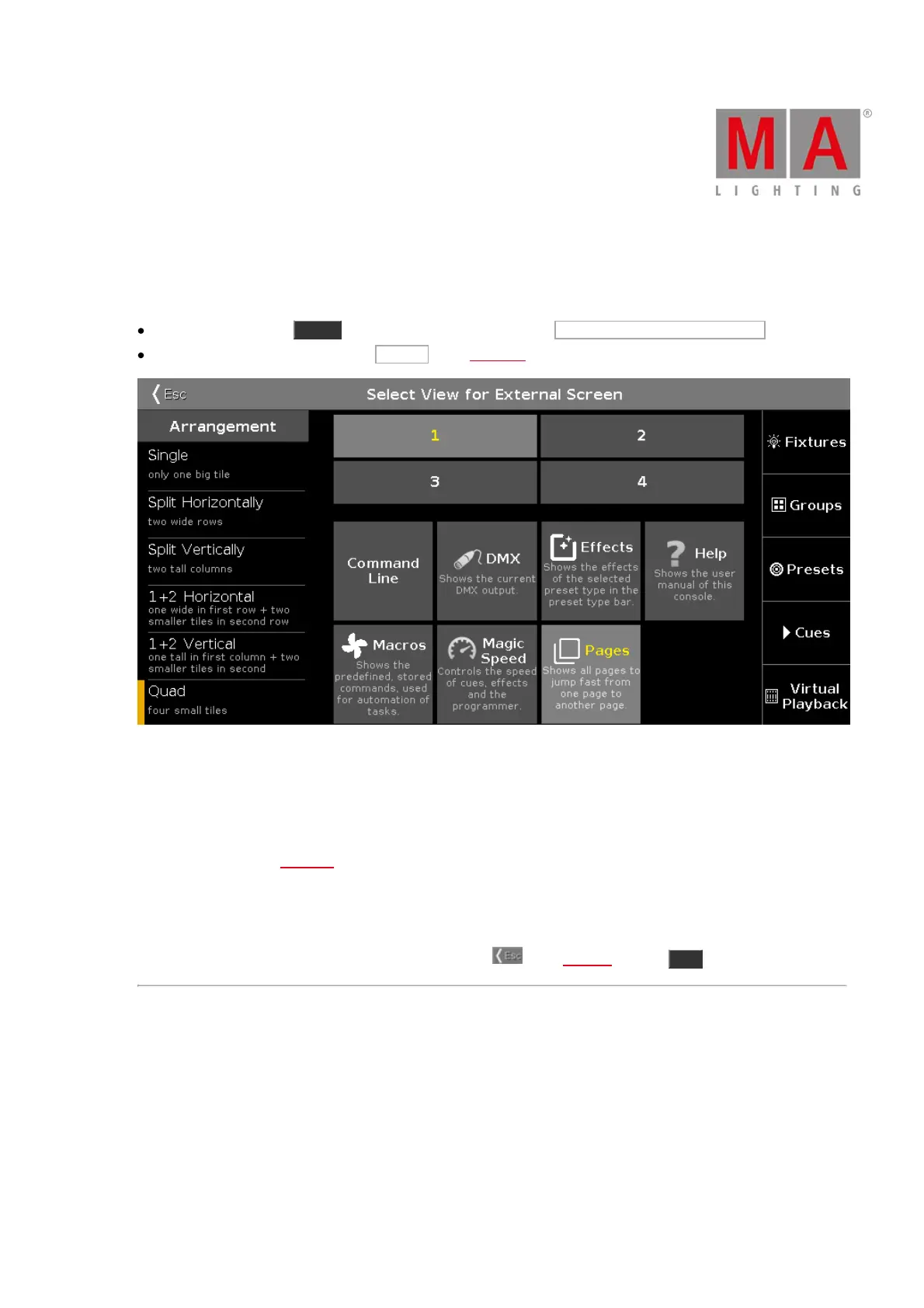 To leave the Select View for External Screen Window, tap in the title bar or press Esc on the console.