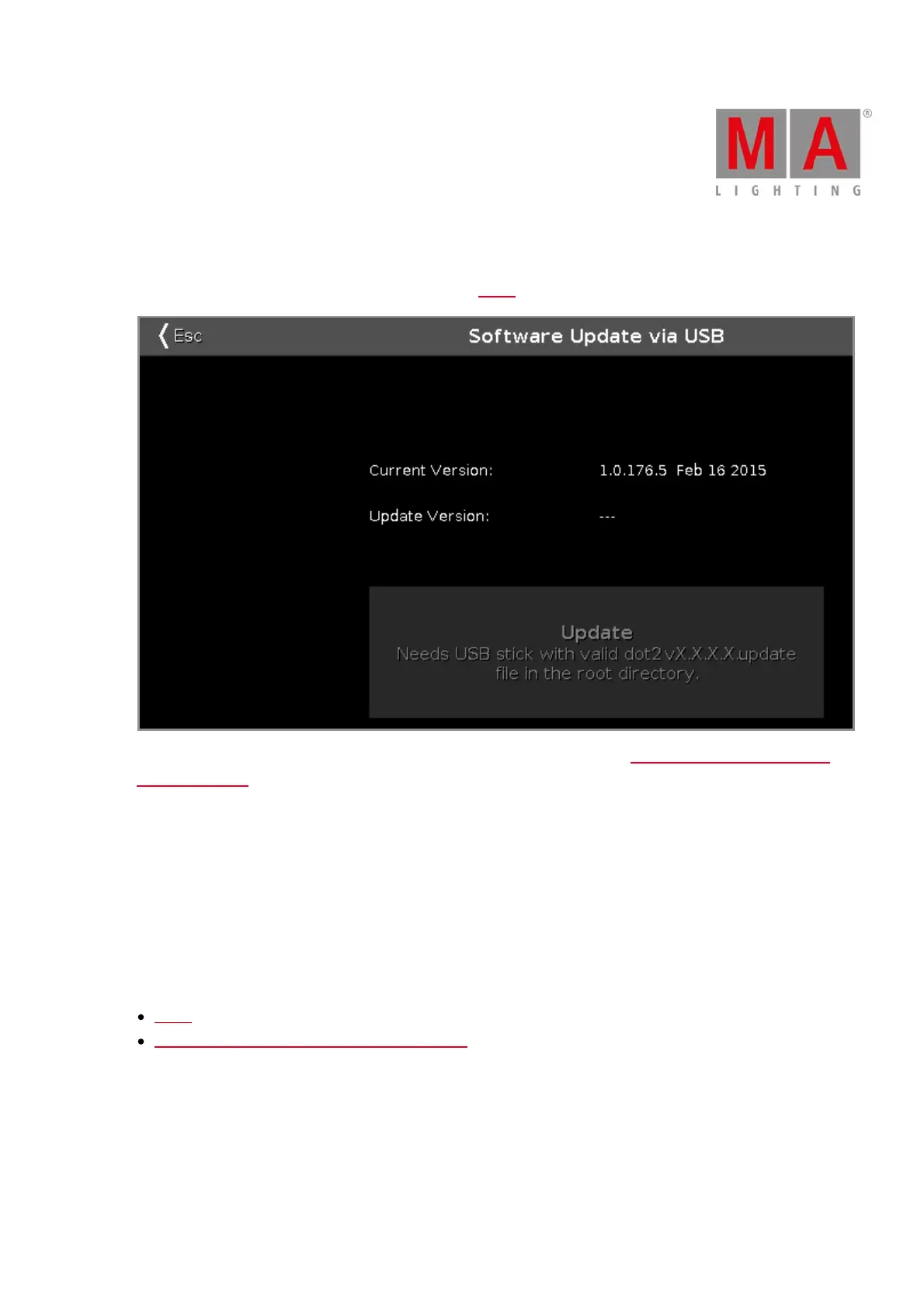 In this window, you update the dot2 console via an inserted USB stick. Refer to, Getting Started Guide - Physical