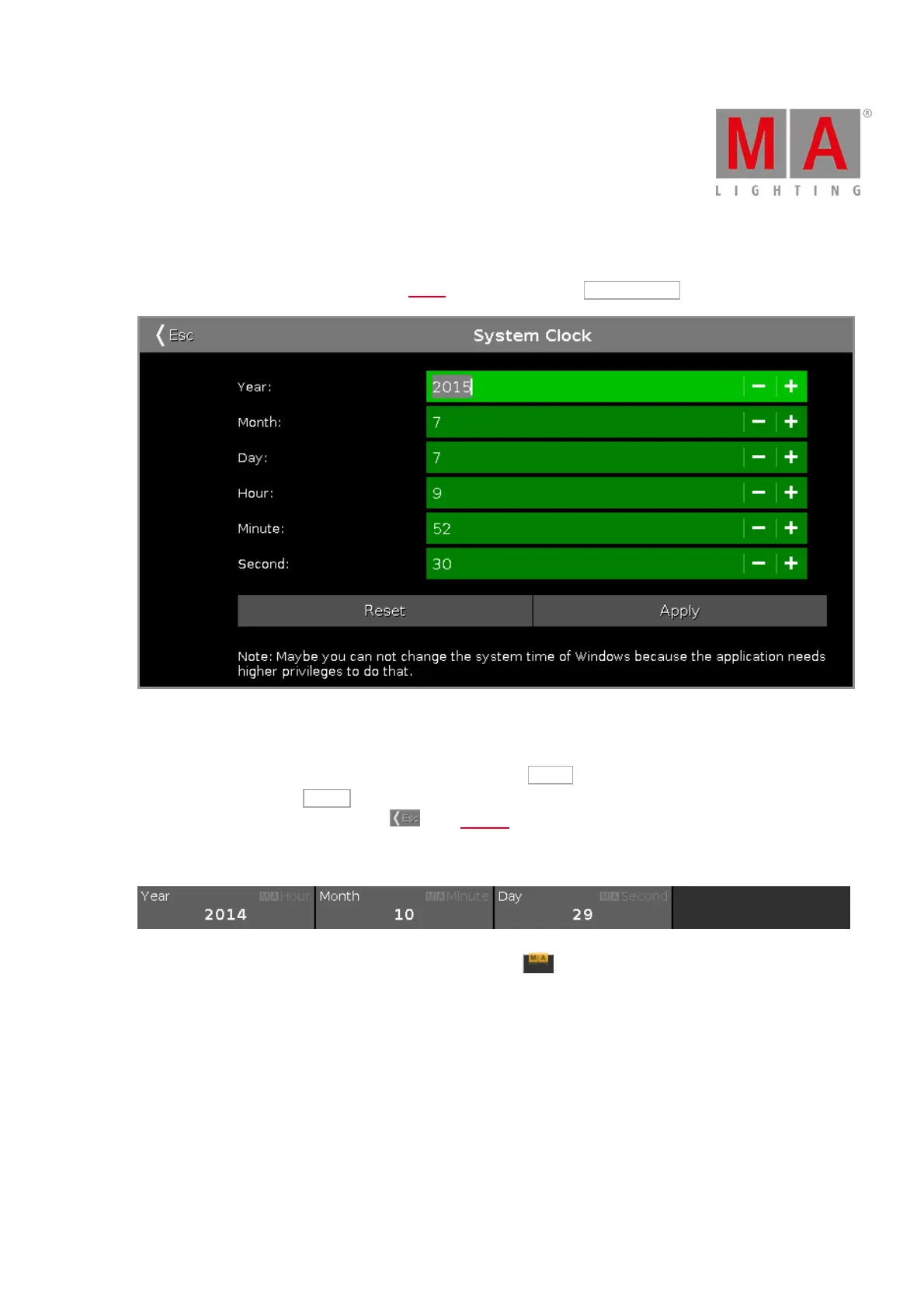 To reset the system clock to the last applied system clock, tap Reset .
