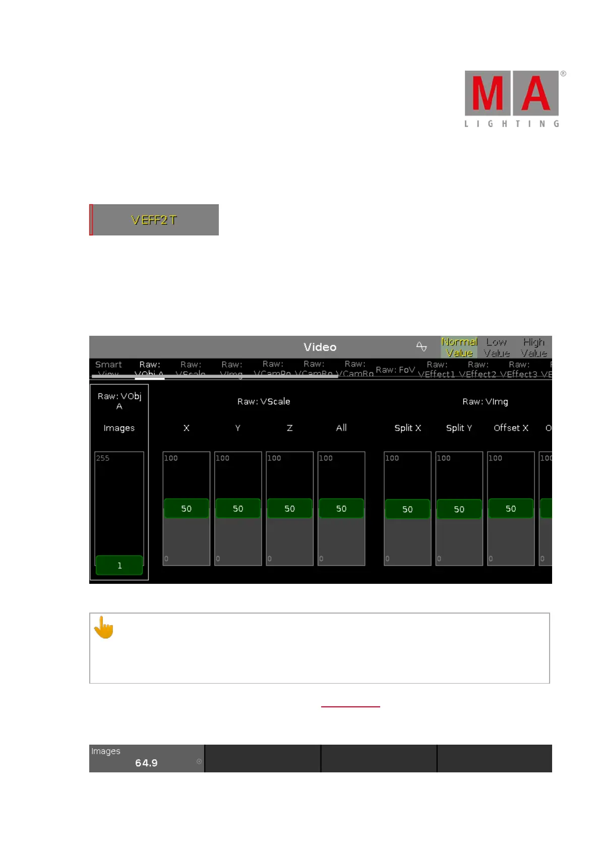 In the raw video view, you control the raw video values in natural values (0-100) of the selected fixture type.