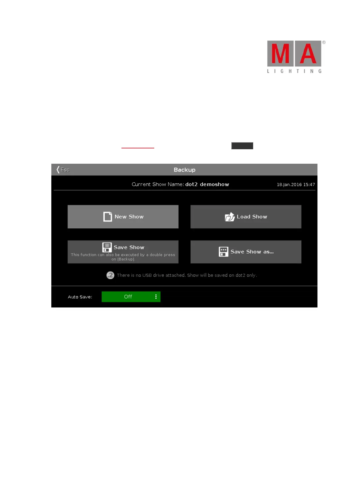 Your shows can be saved to the internal drive of the dot2 console. But it can also be saved to an external USB