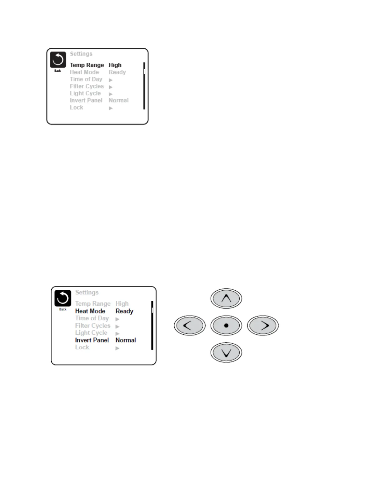 These features include Temp Range, Heat Mode, and Invert Panel. When one of these items is highlighted, the Select Button is used to toggle between