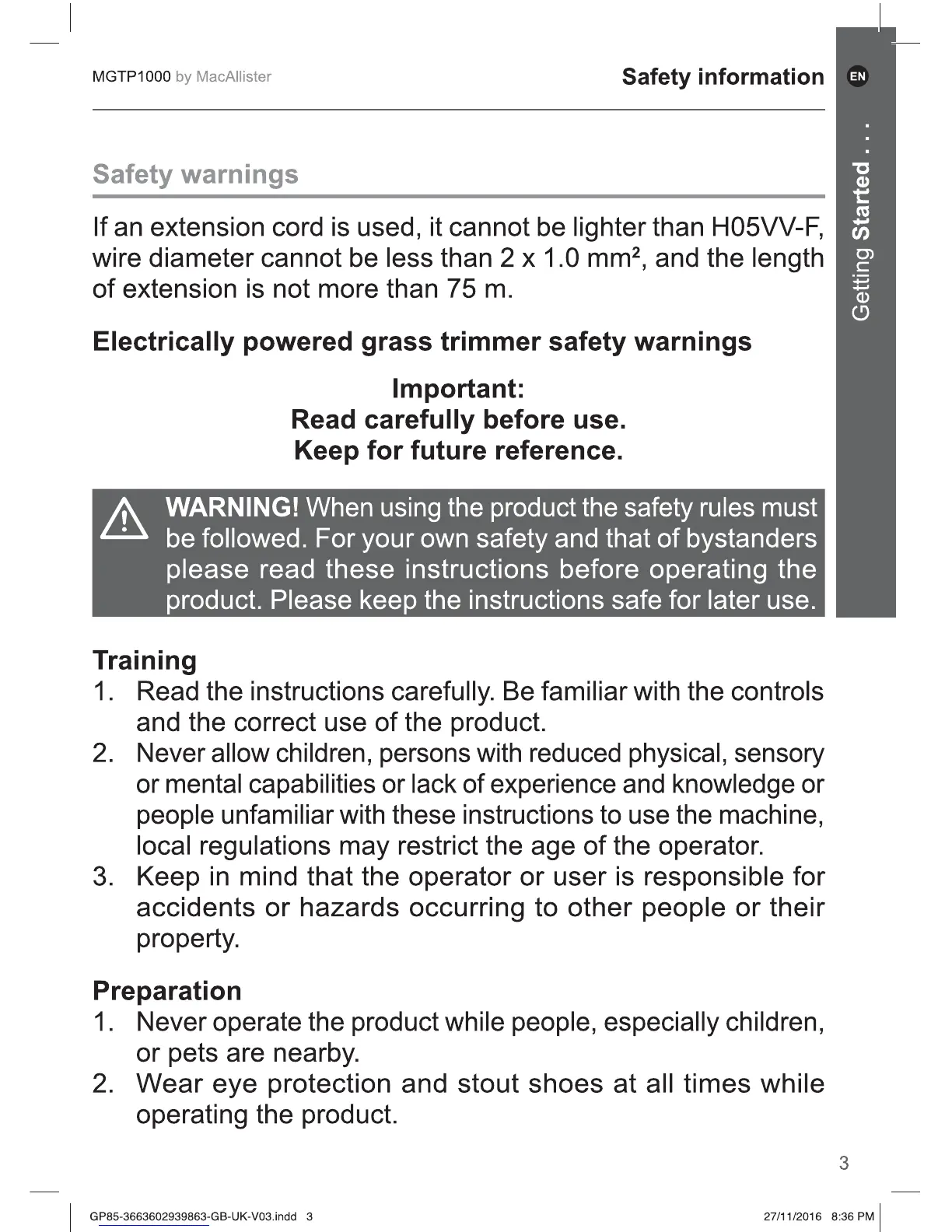 Mac allister MGTP1000 - Safety information; Safety warnings; Training; Preparation