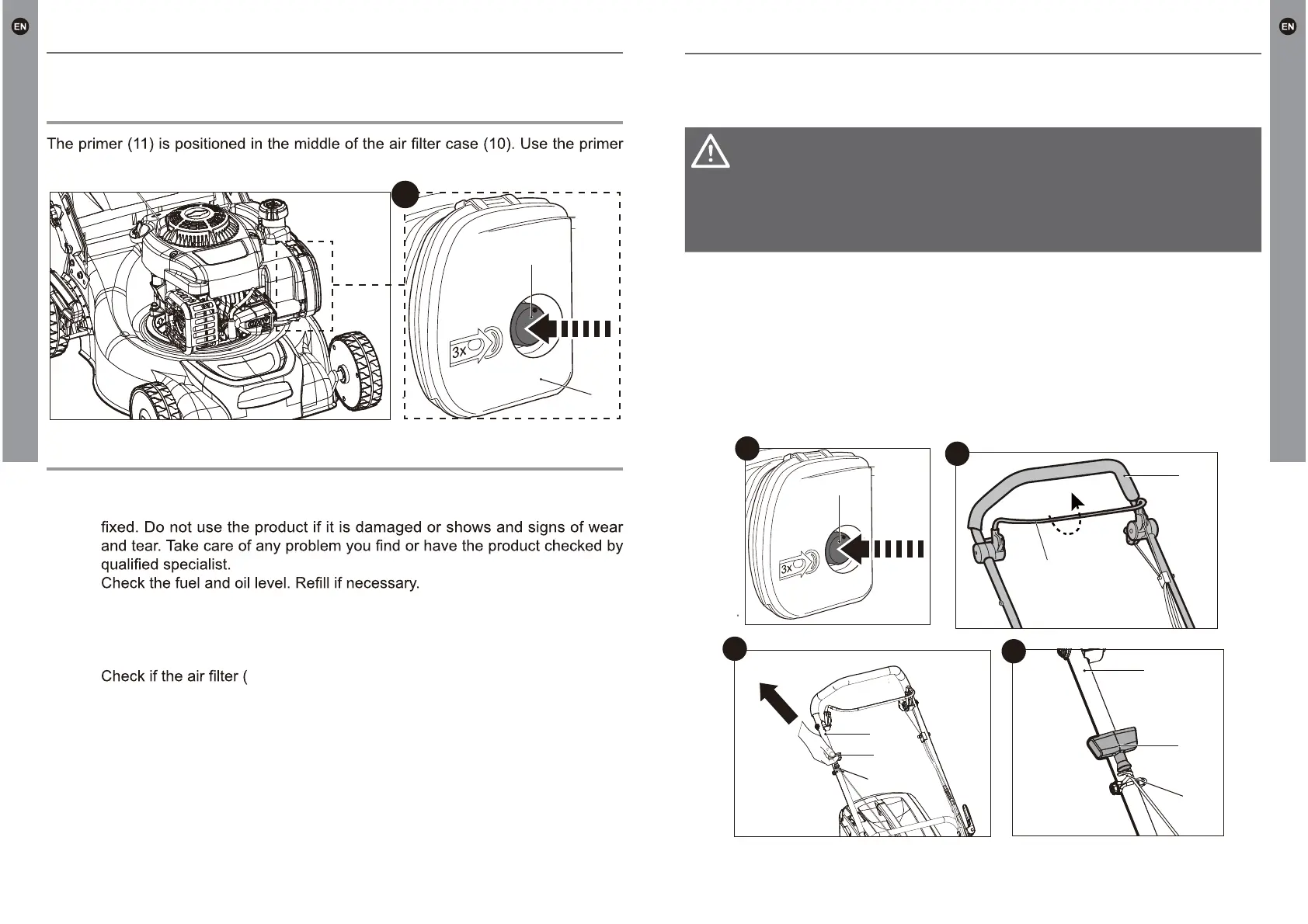 Pull the recoil starter handle (23) lightly until you feel resistance then pull it rapidly.