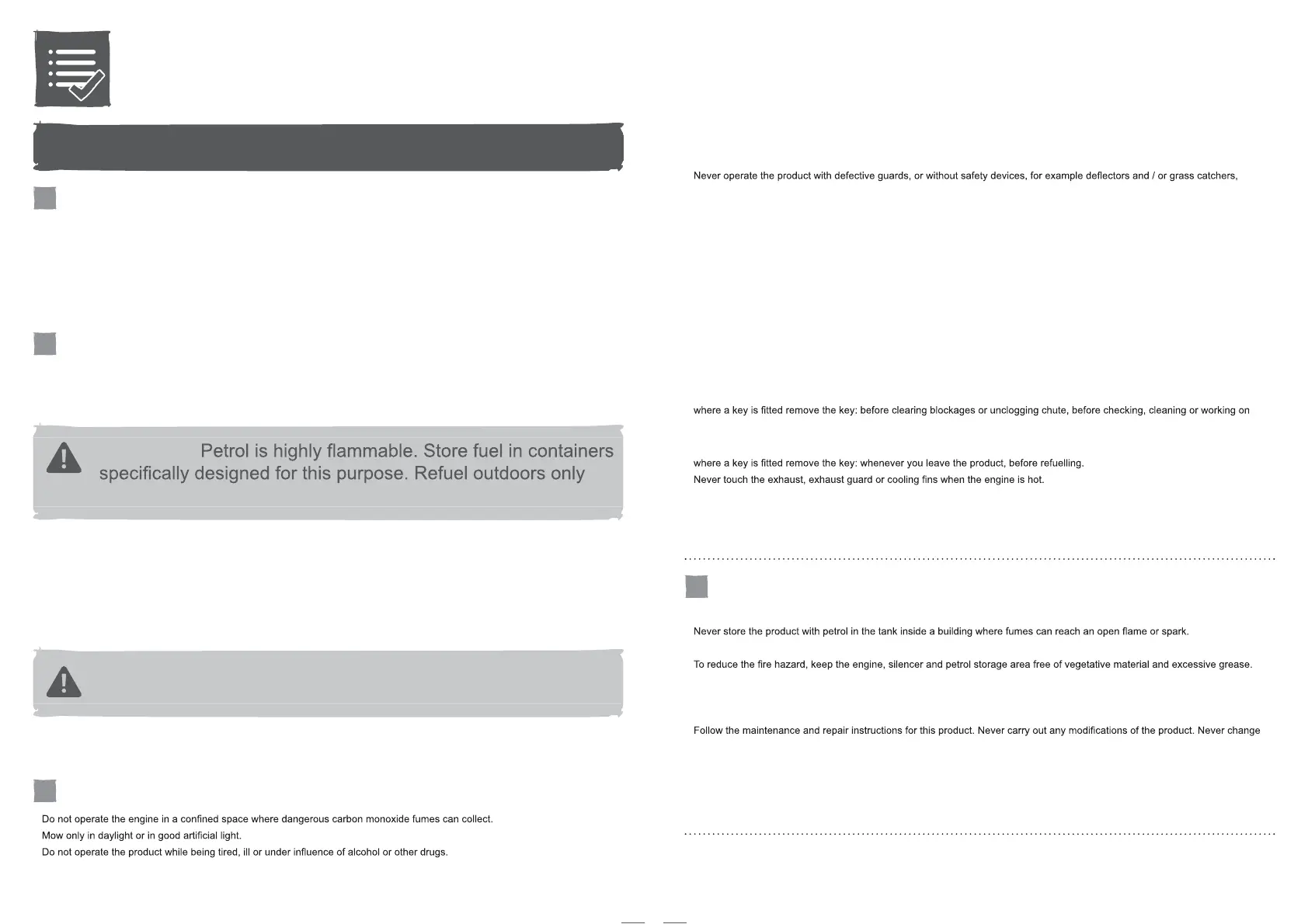 • If petrol is spilled, do not attempt to start the engine but move the product away from the area of spillage and avoid creating any